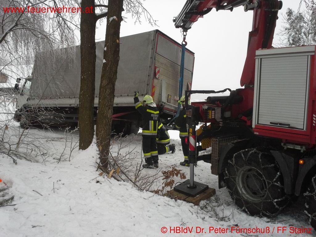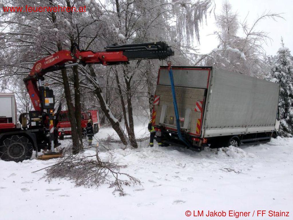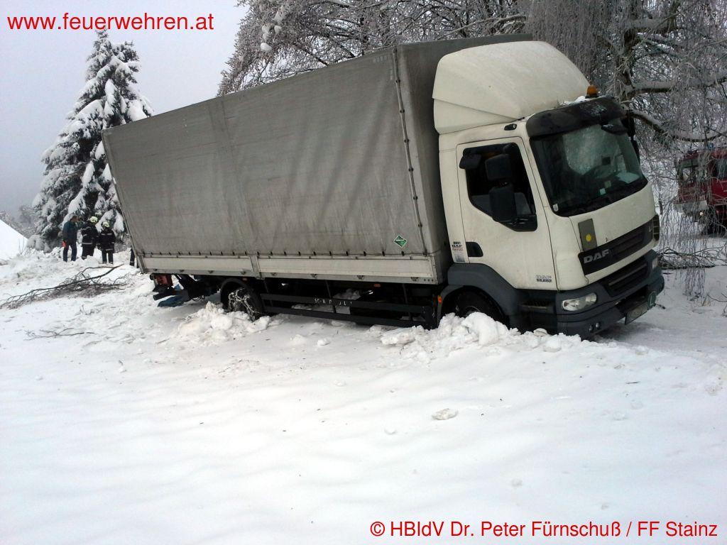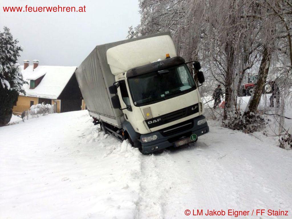 Der Fahrer des 7,5 to schweren LKW’s einer Speditionsfirma wurde Mittwochfrüh im Bezirk Deutschlandsberg durch sein Navigationsgerät in eine Sackgasse gelotst. Die Fahrt endete an einer vereisten Stelle und der LKW rutschte dabei von der zu schmalen Gemeindestraße ab. Die Feuerwehr musste mit einem Kranfahrzeug zur Bergung ausrücken. Die Bergung des Lkw dauerte rund zwei Stunden.