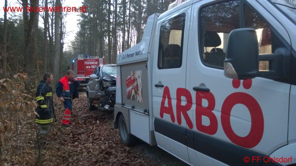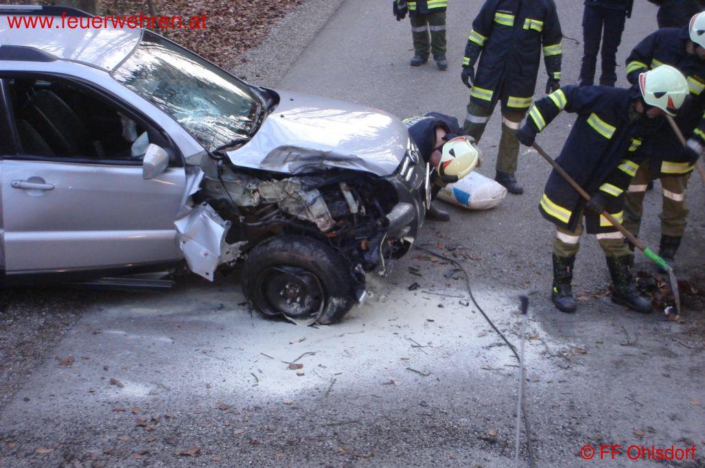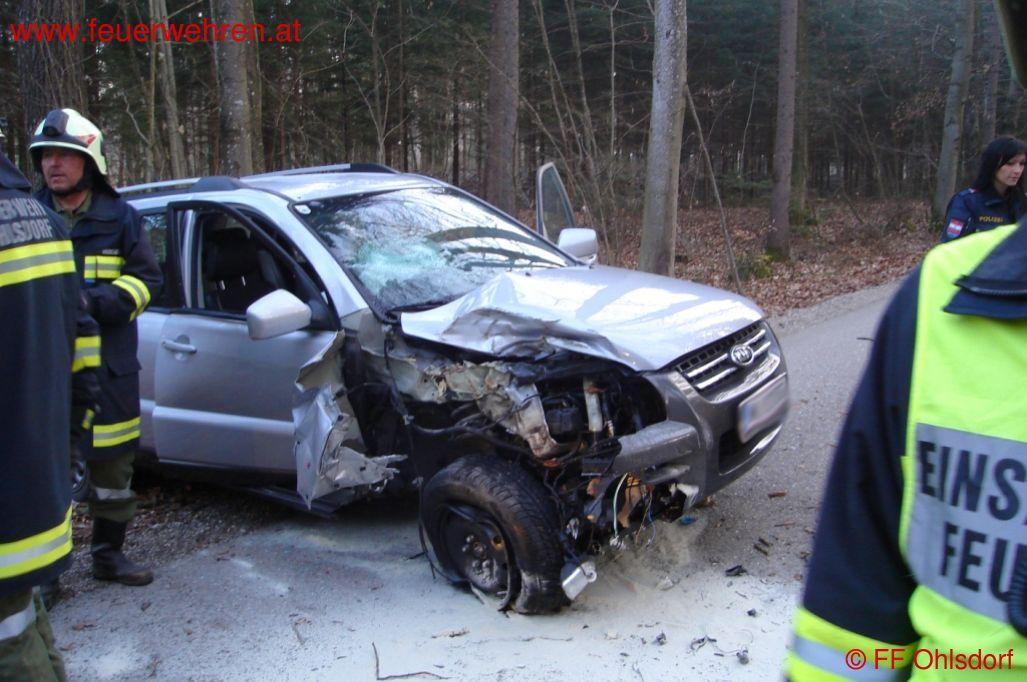 Der Fahrzeuglenker schilderte dass er einem Rehbock ausgewichen war, welcher über die Straße lief. Direkt neben der Straße befindet sich ein Baum, gegen den der Lenker mit seinem Fahrzeug prallte. Obwohl der Aufprall enorm war, blieb der Lenker unverletzt.
