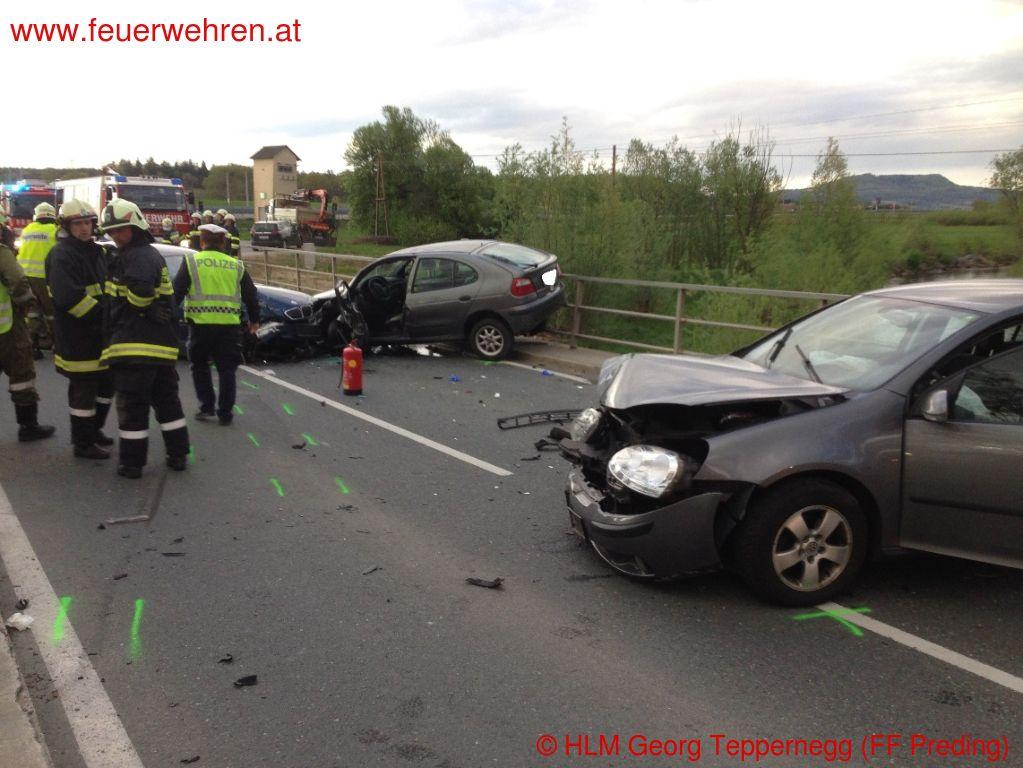 Um 17:40 Uhr heulten bei der Feuerwehr Wettmannstätten und zwei Minuten später bei der Feuerwehr Preding die Sirenen. Als die Feuerwehren am Einsatzort eintrafen musste zuerst die Unfallstelle abgesichert werden. Es wurde eine Totalsperre der Landesstraße veranlasst. Im Anschluss musste eine Person mittels hydraulischem Rettungsgeräts aus einem PKW gerettet werden.