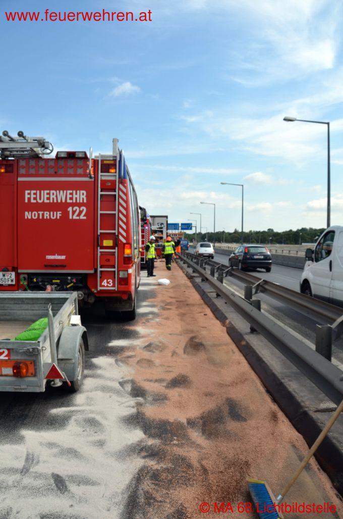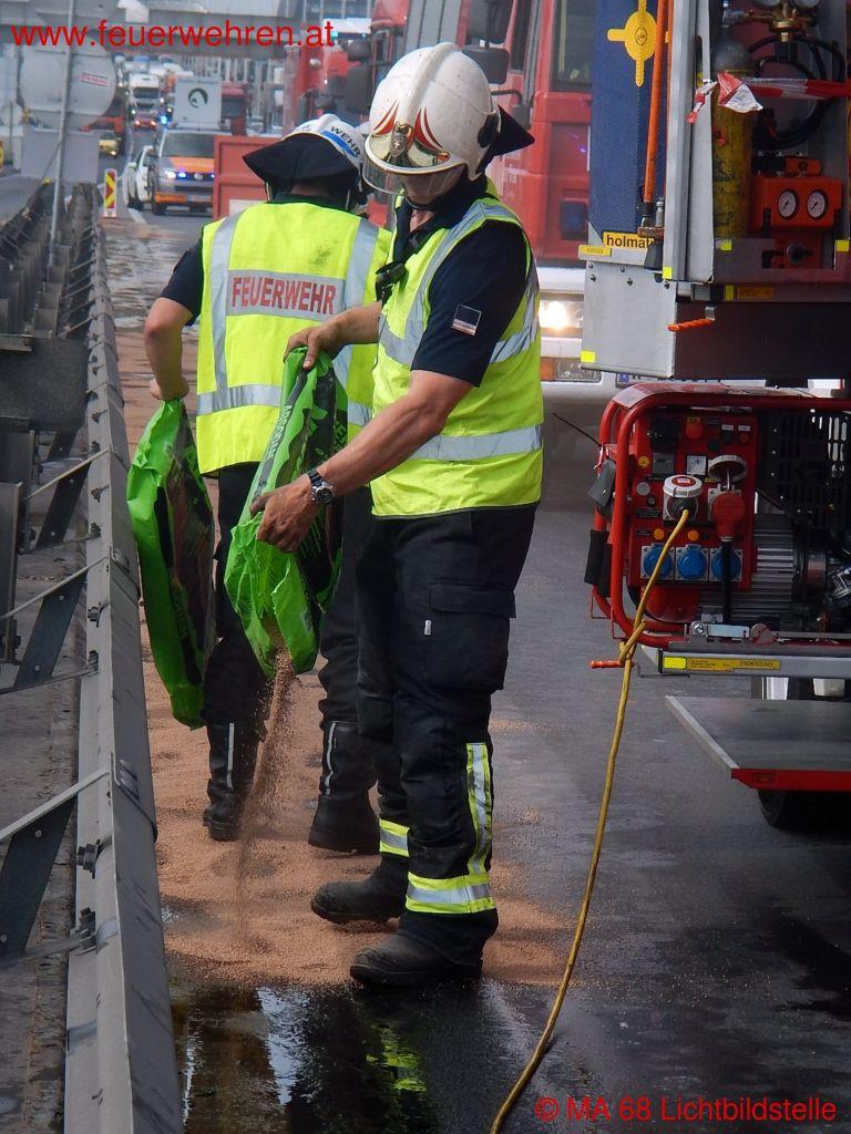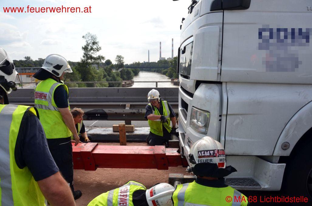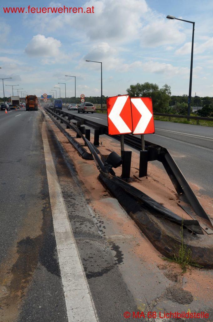 Dabei wurden das rechte Vorderrad und der rechte Dieseltank beschädigt. Nach ca. 300m war der LKW-Zug zum Stillstand gekommen. Dabei waren größere Mengen Dieselkraftstoff ausgeflossen, welcher die Fahrbahn verunreinigte und teilweise von der Brücke in den Donaukanal rann.
