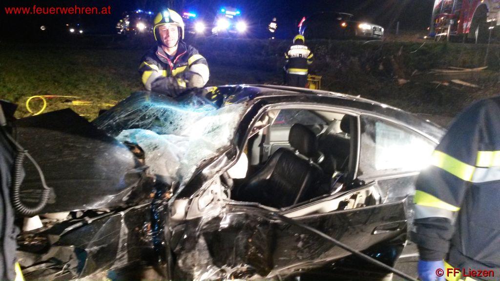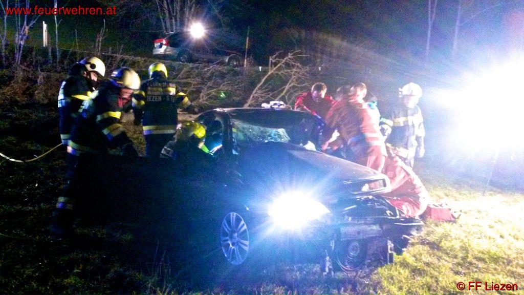 Eine junge Frau aus dem Bezirk Liezen war mit ihrem PKW in Fahrtrichtung Ardning von der Straße gekommen, über eine Böschung gestürzt und durch den Aufprall mit zwei Bäumen schwer verletzt worden. Ein – kurz nach dem Unfall – vorbeifahrender Sanitäter des Roten Kreuzes hatte das Unfallwrack entdeckt und Alarm geschlagen. Binnen weniger Minuten waren alle Einsatzkräfte (FF Liezen-Stadt, RK Liezen, Notarztteam Rottenmann, Polizei) am Einsatzort.