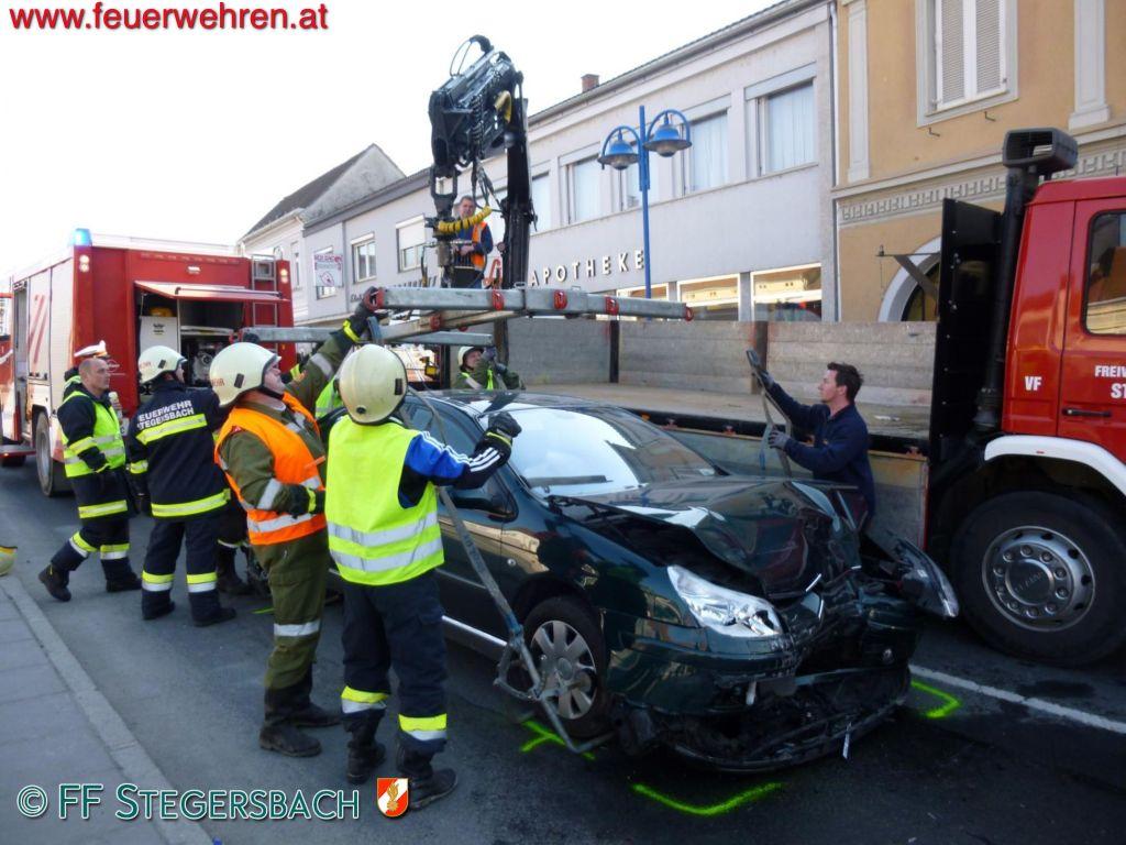 Entgegen der Alarmmeldung war niemand im Fahrzeug eingeklemmt. Die Feuerwehr Stegersbach führte die Fahrzeugbergung des hinteren PKWs durch. Der unbestimmten Grades verletzte Fahrer wurde mit der Rettung ins Krankenhaus gebracht.