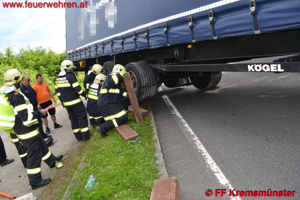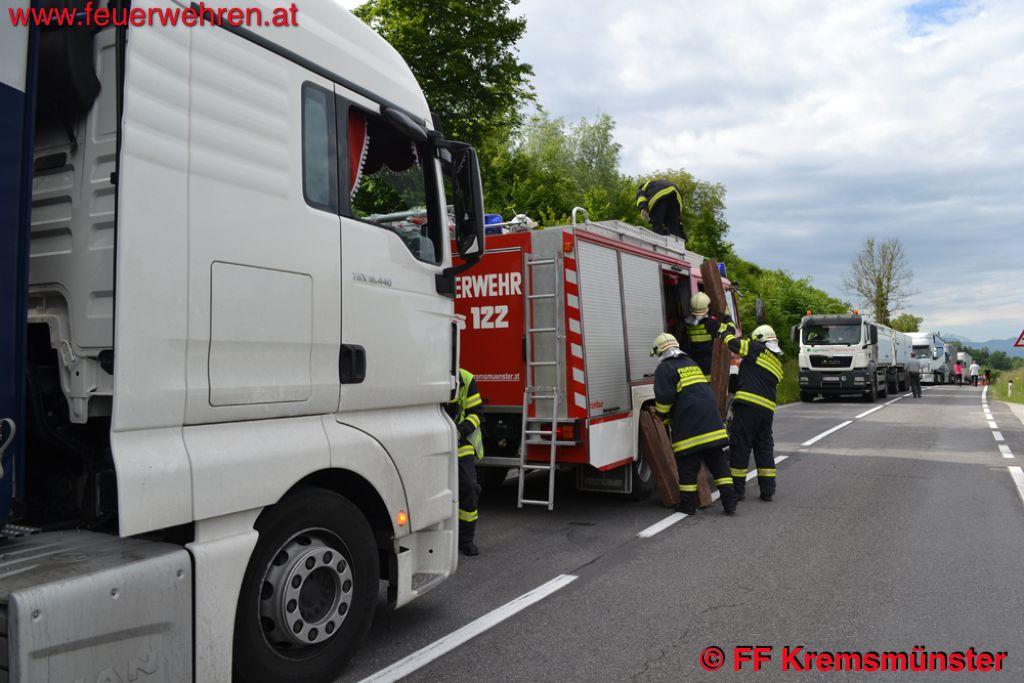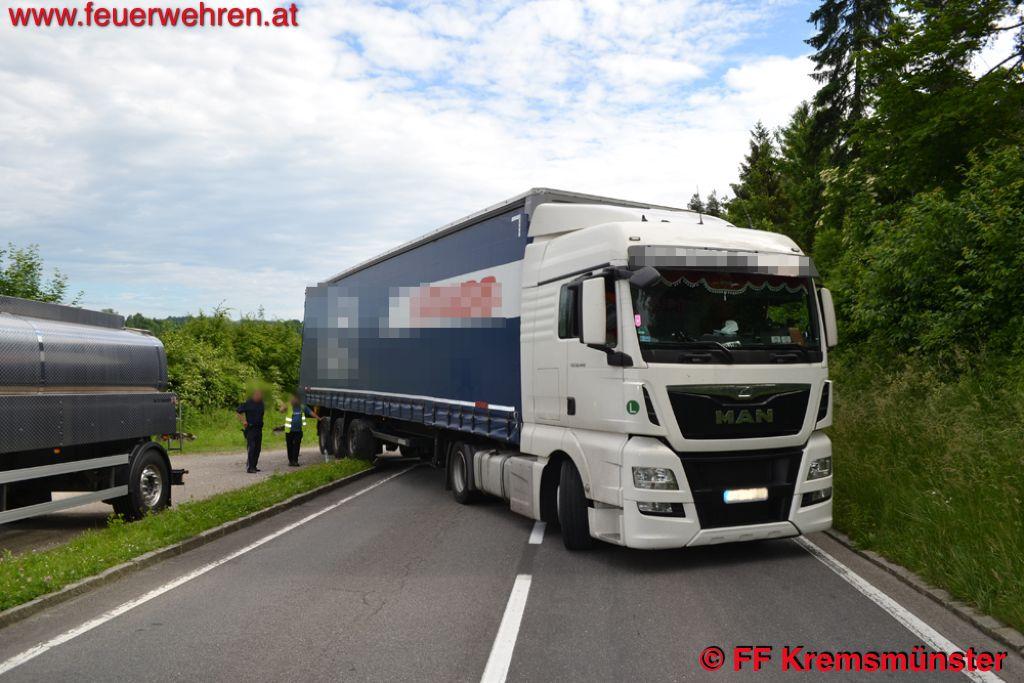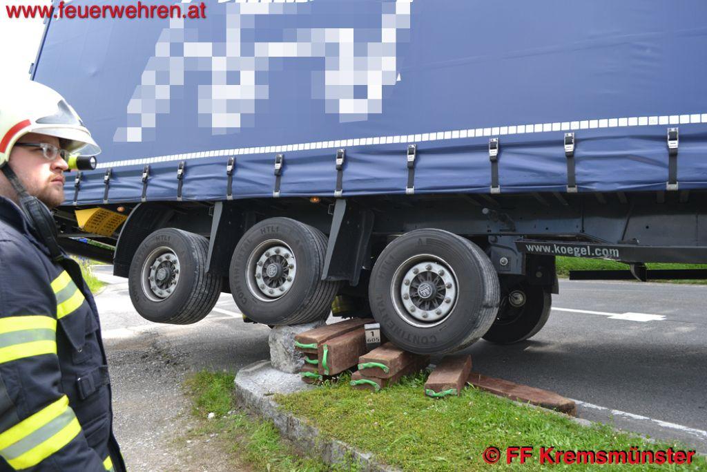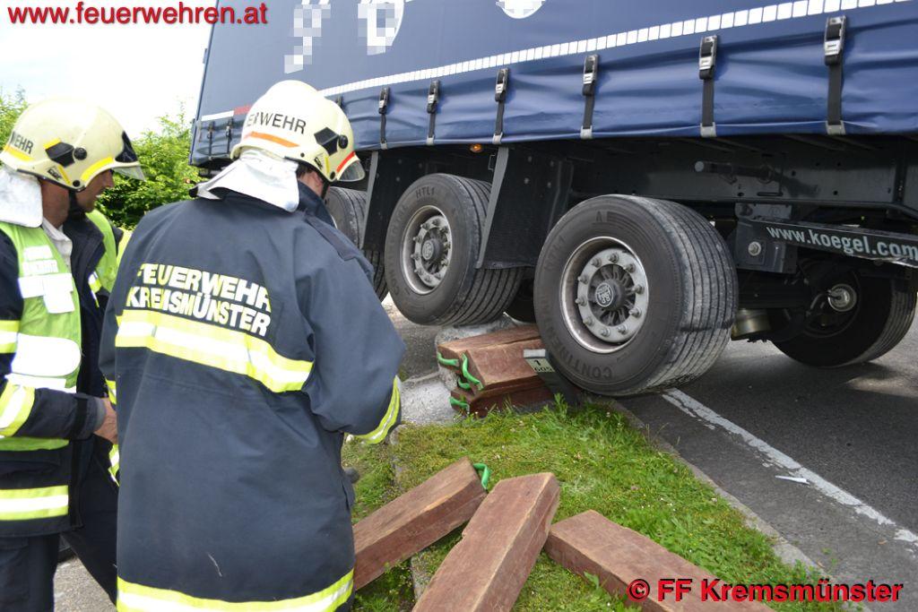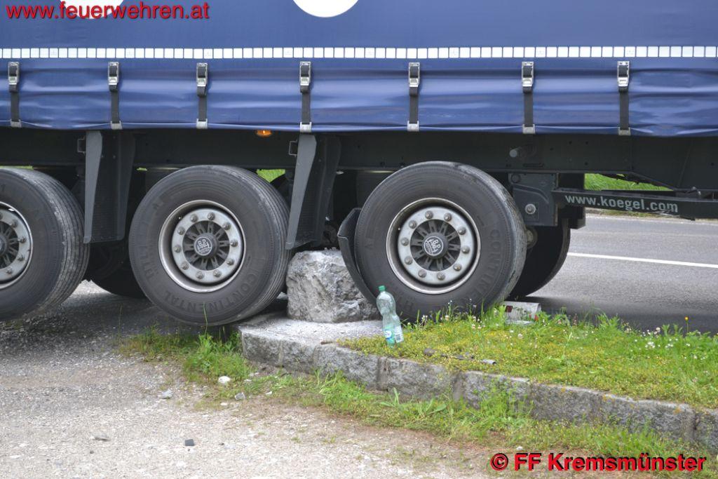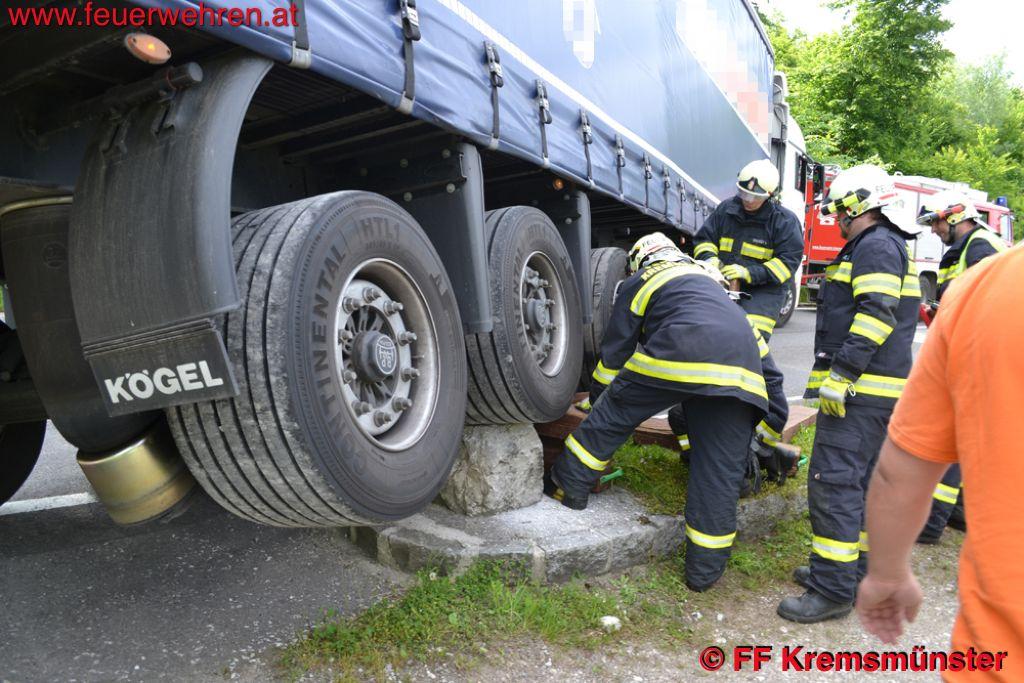 Am Dienstag den 02.06.2015 wurde die FF-Kremsmünster zu einer LKW Bergung Höhe Fa. Greiner Packaging alarmiert. Der Lenker des LKWs brachte den leeren Sattelanhänger in solch eine Lage, dass sich ein einbetonierter Begrenzungsstein des Parkplatzes zwischen zwei Räder befand. Der LKW konnte weder vor noch zurück. Außerdem sperrte er die Schlierbacher Landesstraße.