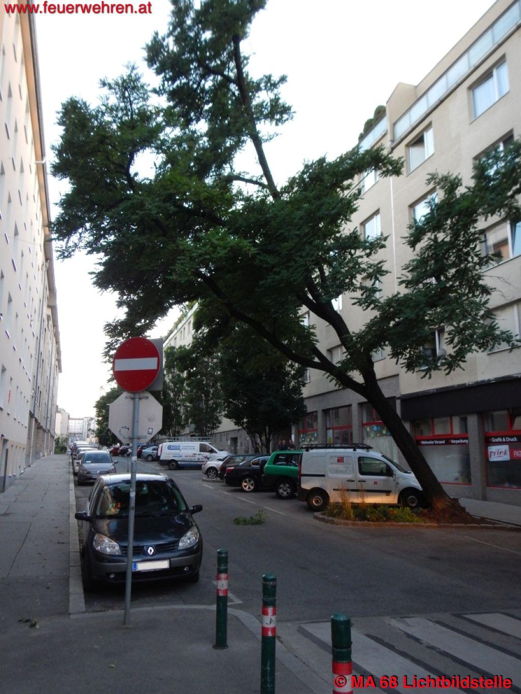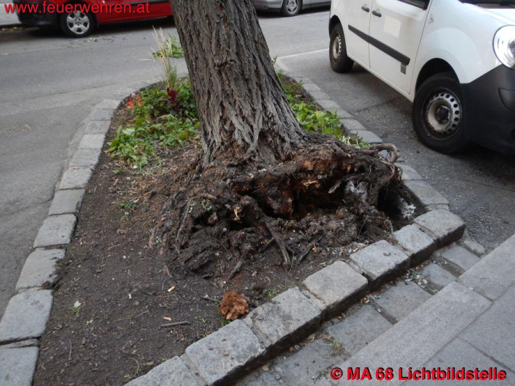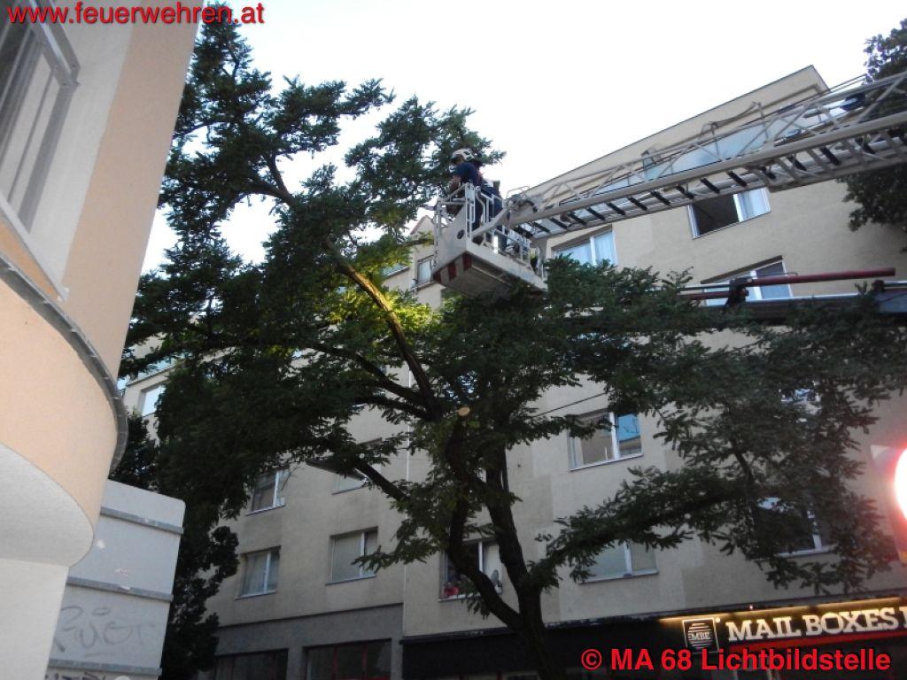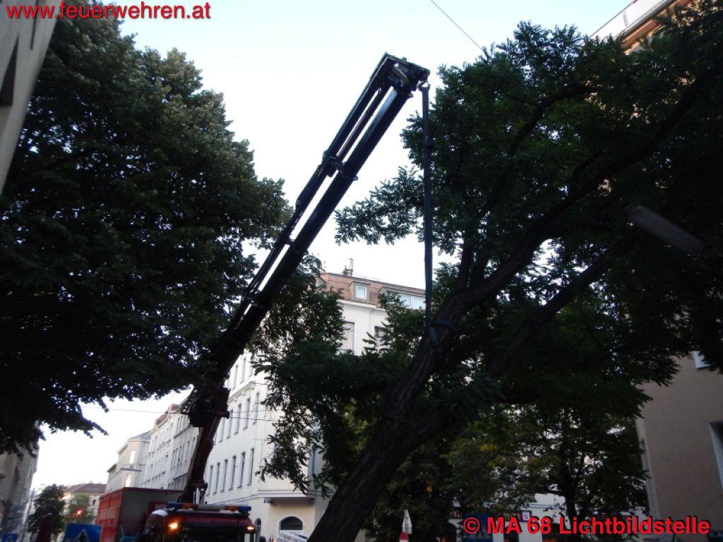Nach Ankunft der Feuerwehr wurde der Gefahrenbereich abgesperrt und die Leitungen von der MA 33 stromlos geschalten. Anschließend wurde der Baum mit Hilfe eines Kranes sowie einer Drehleiter kontrolliert umgeschnitten.