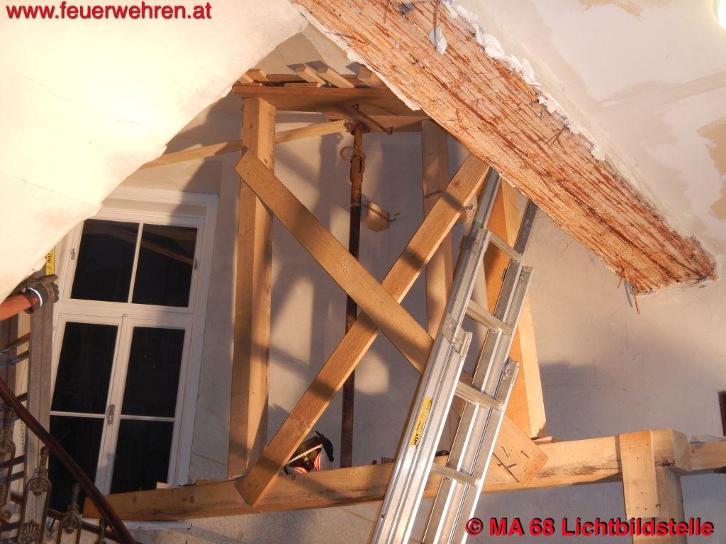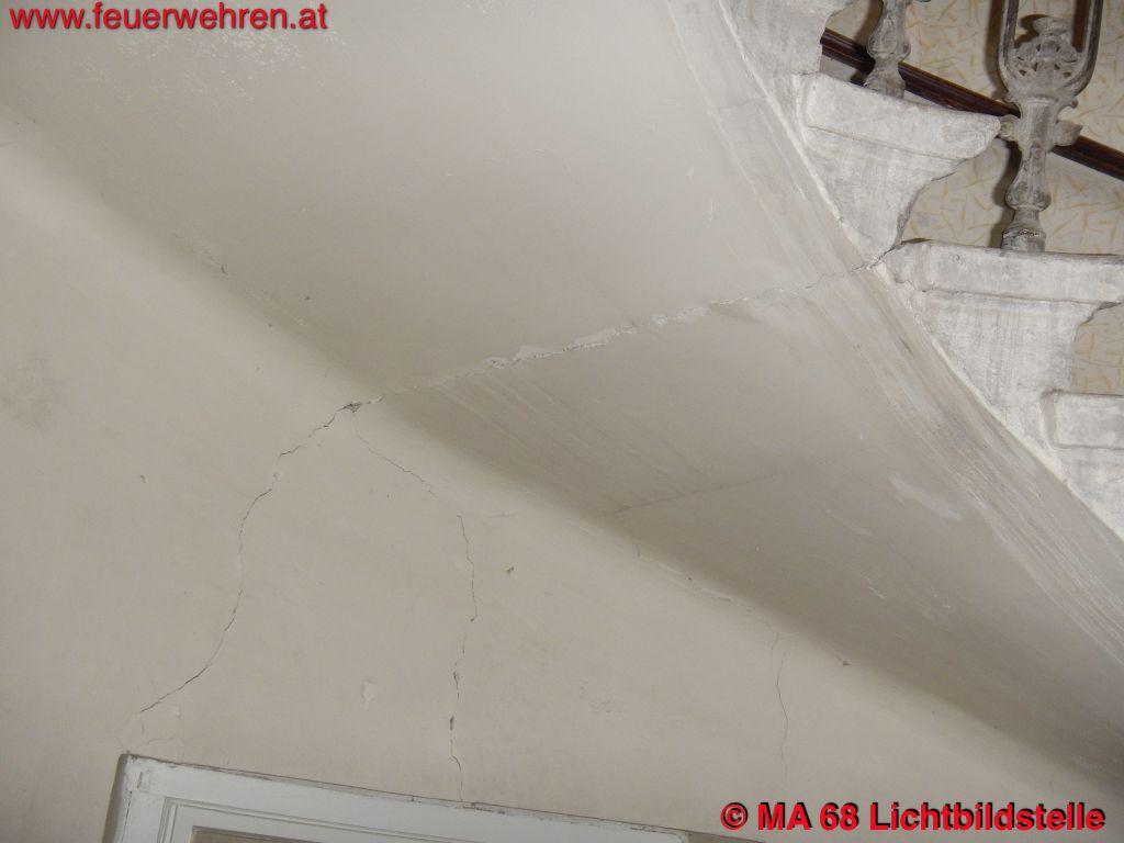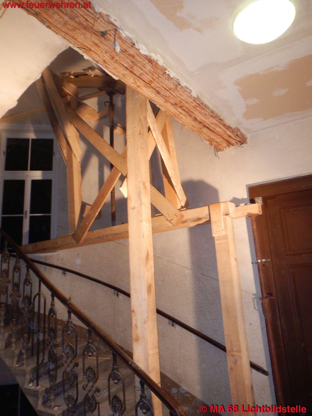 Dadurch löste sich der Verputz der Untersicht des Stiegenlaufes auf einer Fläche von ca. 1,5 m2 und fiel im Stiegenhaus zu Boden. Das einsturzgefährdete Stiegenhaus wurde von der Feuerwehr sofort gesperrt und anschließend mittels einer provisorischen Pölzung gesichert.
