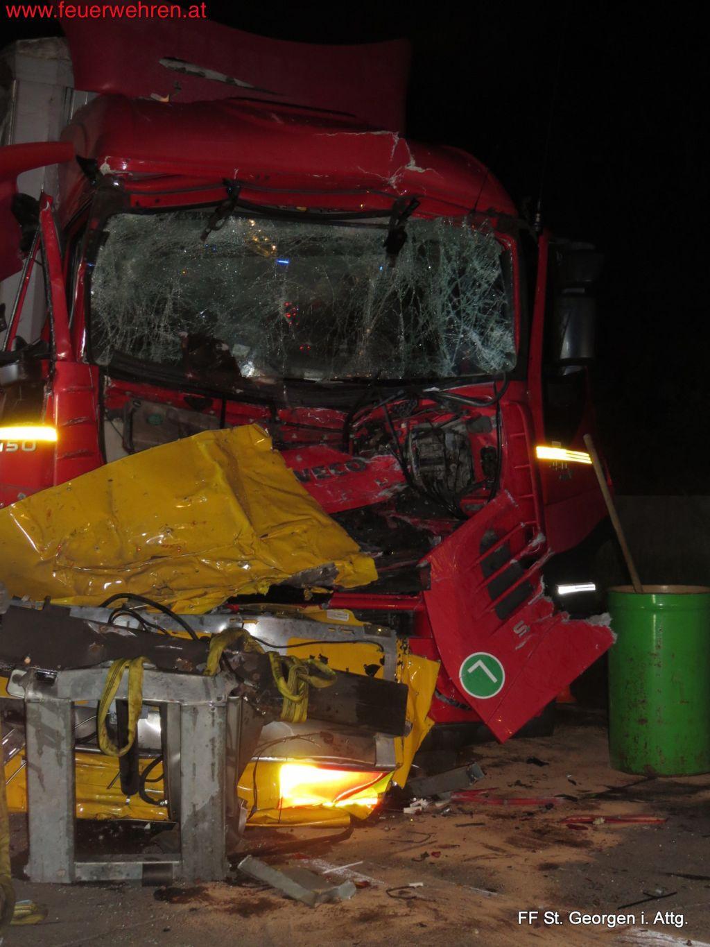 Nach der Übergabe des Patienten an den anwesenden Notarzt wurden die ausgelaufenen Betriebsstoffe gebunden und die Fahrbahn gereinigt. Die Bergung der verkeilten LKW gestaltete sich äußerst schwierig und zeitaufwendig. Das Führerhaus musste demontiert werden, um den Abtransport durch ein privates Abschleppunternehmen zu ermöglichen.