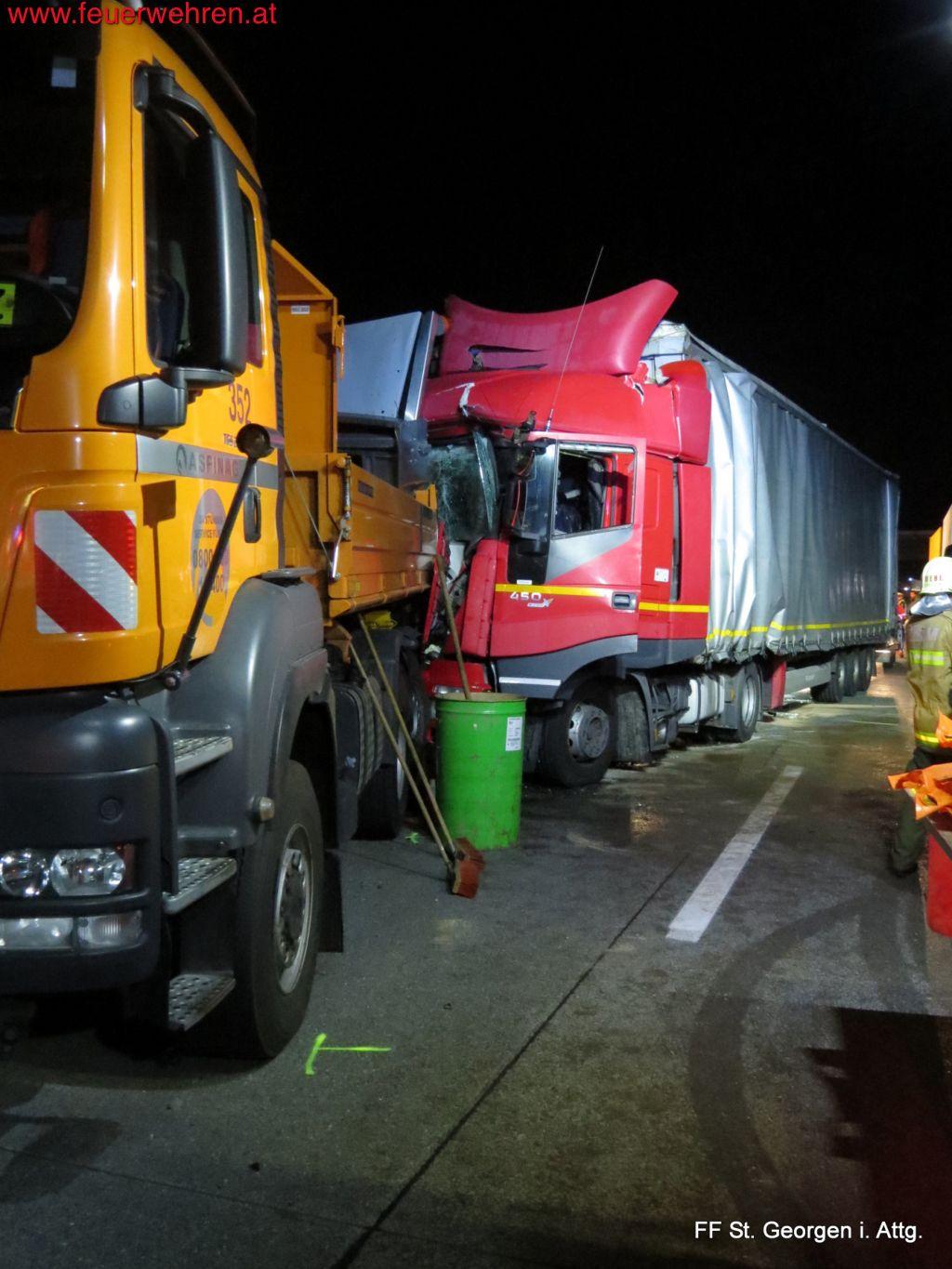 Ein Rumänischer Sattelschlepper fuhr aus bisher unbekannter Ursache im Tagesbaustellenbereich auf einen mit Warneinrichtungen aufgebauten LKW der Asfinag beinahe ungebremst auf, der am ersten Fahrstreifen zur Absicherung einer Baustelle stand.