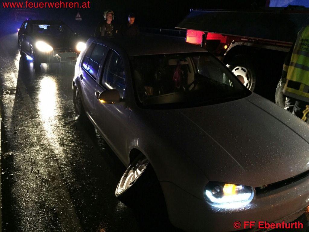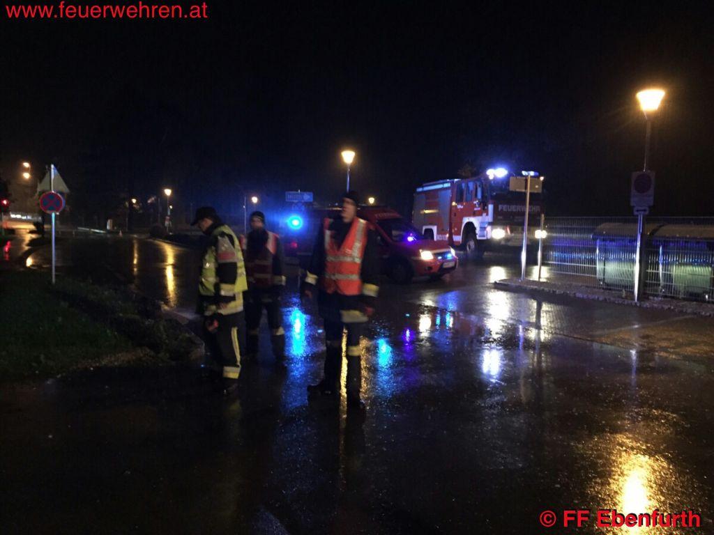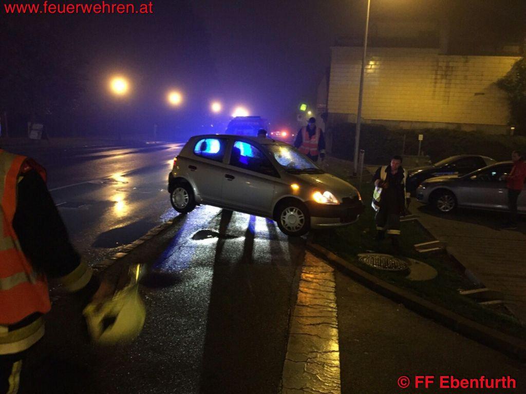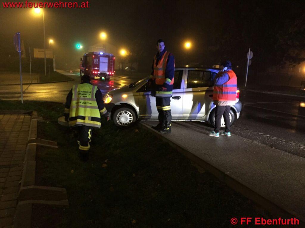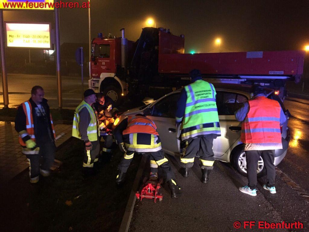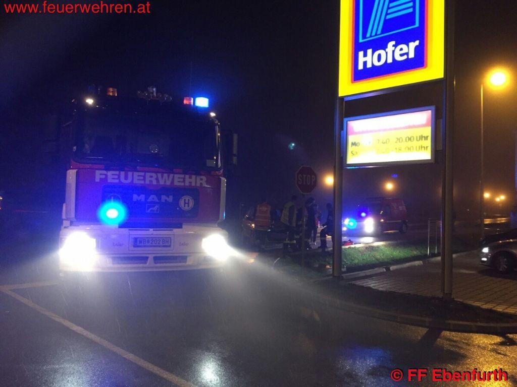 Am Donnerstag den 15. Oktober 2015 um 19:33 Uhr wurde die Freiwilllige Feuerwehr der Stadt Ebenfurth zu einer Fahrzeugbergung auf die Hauptstraße alarmiert. Eine Fahrzeuglenkerin war vermutlich infolge Blendung durch den Gegenverkehr zu früh in den Parkplatz eines Geschäfts eingebogen, hatte die Einfahrt um einige Meter verfehlt und war nach dem Überqueren des Gehsteigs auf der Randsteinabgrenzung der Sickerrinne des Geschäftsparkplatzes hängen geblieben. Das Fahrzeug wurde händisch vom Randstein gehoben und die Lenkerin konnte ihre Fahrt fortsetzen.