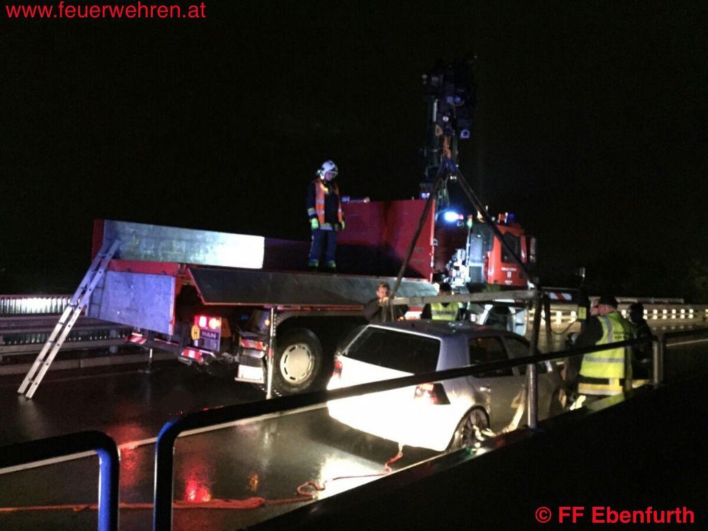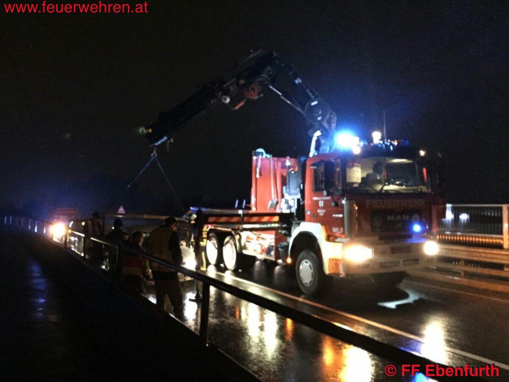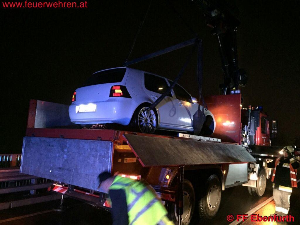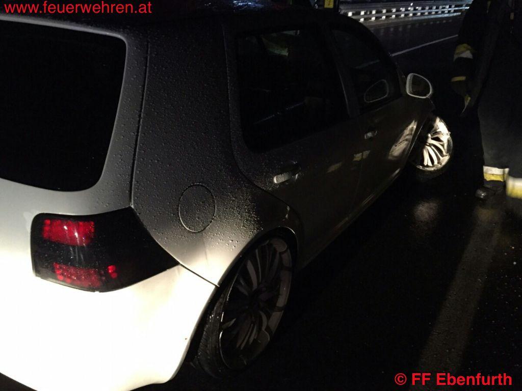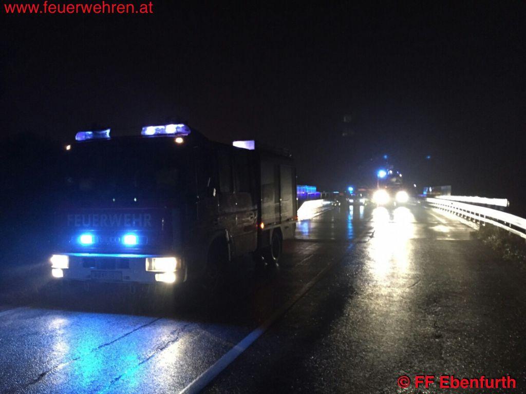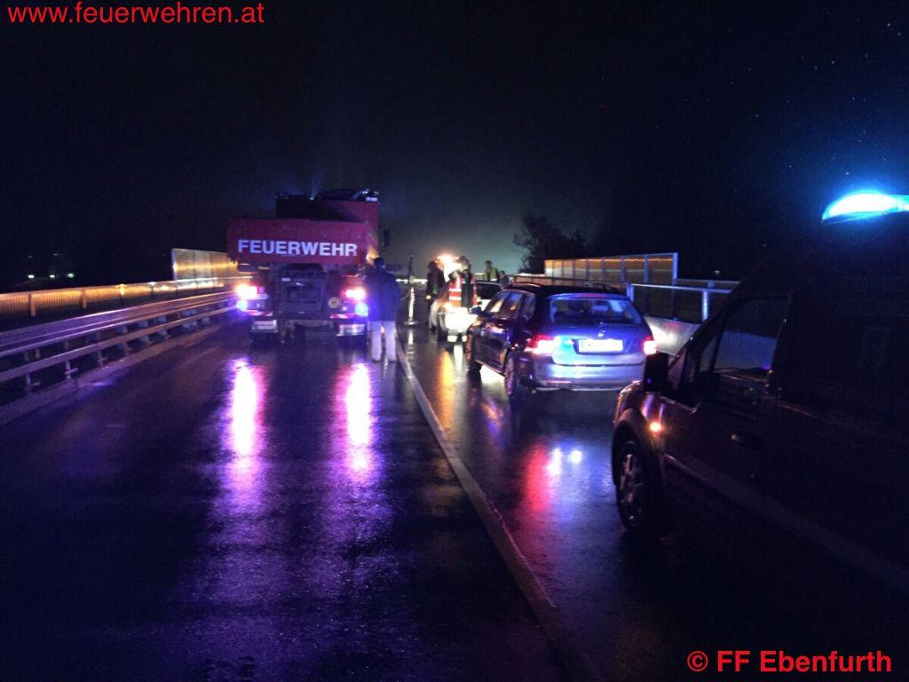 Kaum mit dem Aufrüsten der eingesetzten Fahrzeuge fertig wurde die Feuerwehr der Stadt Ebenfurth um 22:53 Uhr zum dritten Einsatz dieser Nacht alarmiert. Ein nach einem Unfall verkehrsbehindernd unübersichtlich nach einer Fahrbahnkuppe auf der Eisenbahnüberführung stehender PKW mit abgerissener Halbachse war mittels WLF-Kran zu entfernen und für die Abholung durch ein Abschleppunternehmen bereitzustellen. Um 00:30 Uhr konnte schließlich nach der Rückkehr ins Feuerwehrhaus wieder die Einsatzbereitschaft an die BAZ Wr. Neustadt gemeldet werden.