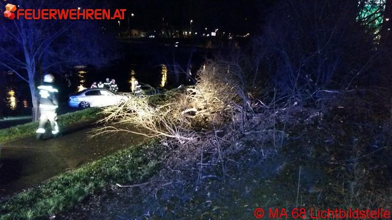 Da aufgrund der Alarmierung nicht ausgeschlossen werden konnte, dass sich auch Personen im Wasser befinden, wurde unverzüglich ein Feuerwehrboot besetzt und ebenfalls alarmiert. Bei unserer Ankunft hatte sich der Lenker bereits selbstständig aus dem Fahrzeug befreit, wurde von der Rettung betreut und gab an, dass er alleine im Fahrzeug war.