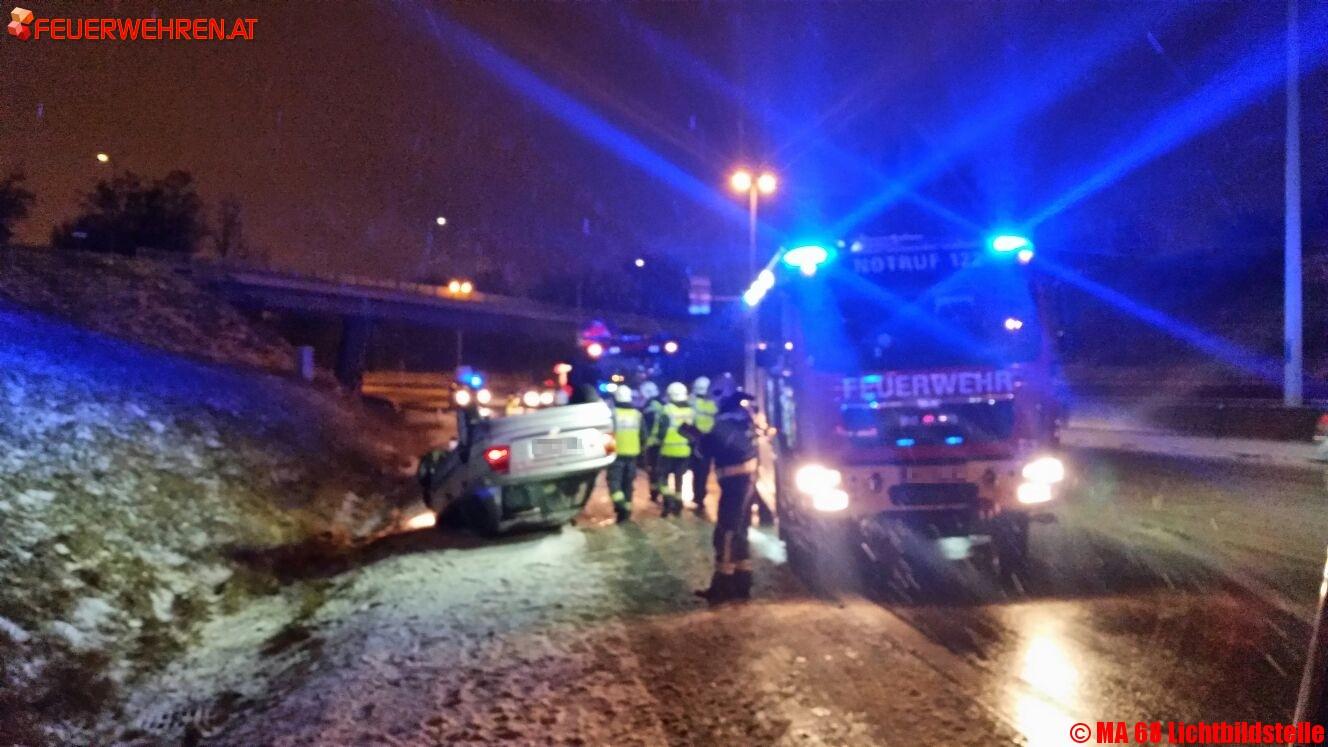 Während der Anfahrt der Berufsfeuerwehr Wien konnte der Fahrzeuglenker von nachfolgenden Autofahrern aus dem Fahrzeug befreit werden.
