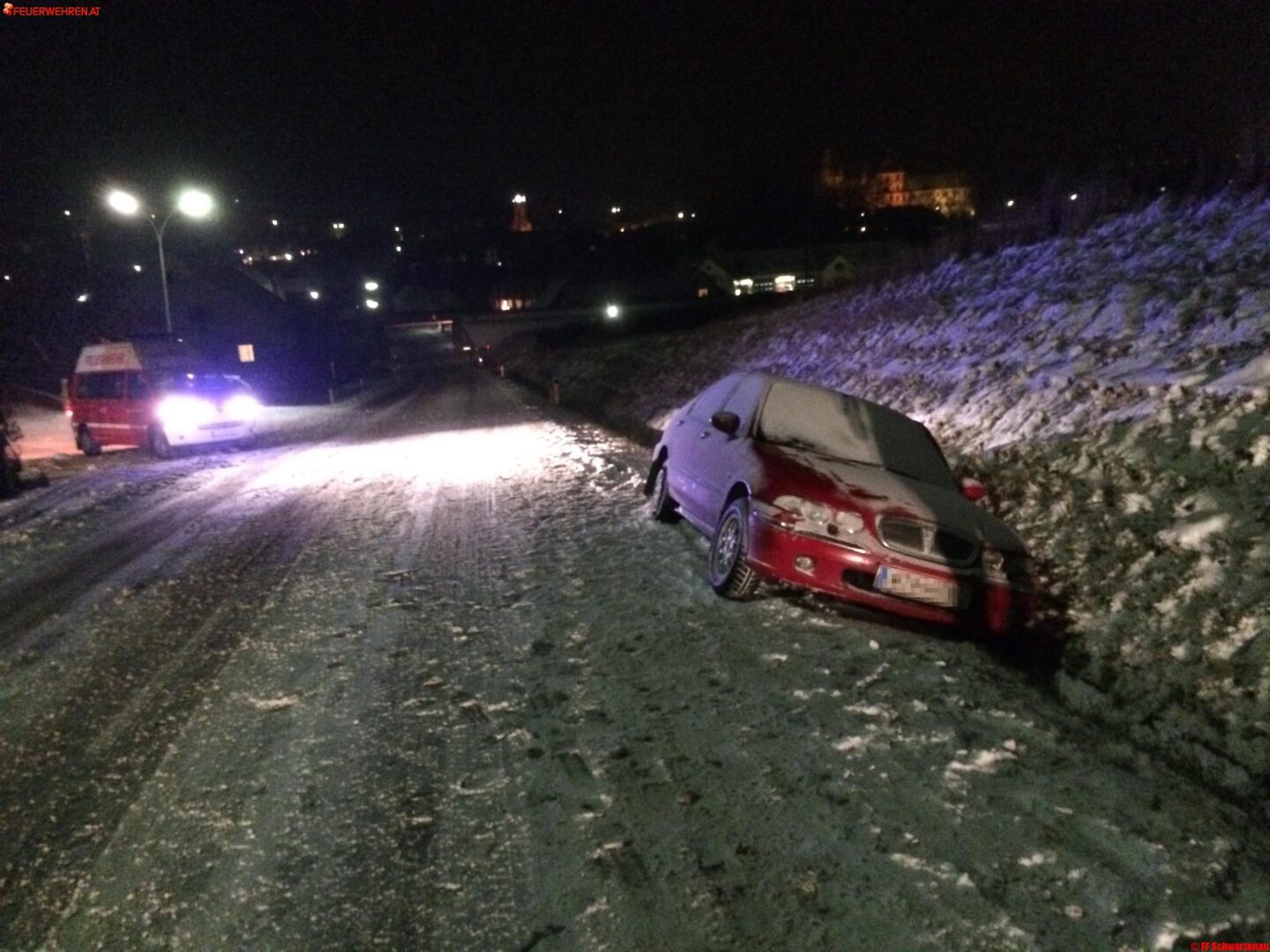 Kurze Zeit später rückten 10 Mitglieder mit RLFA- und KDO-Fahrzeug zur Unfallstelle, welche sich auf der Zwettlerstraße befand, aus. Vermutlich aufgrund der schneeglatten Fahrbahn kam ein Fahrzeuglenker ins Schleudern und schlitterte in den Straßengraben. Verletzt wurde glücklicherweise niemand!