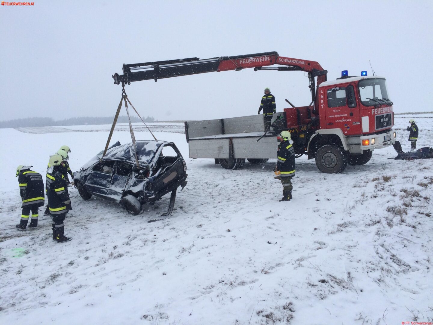 Nachdem von den Beamten die Unfallaufnahme abgeschlossen war, führten wir die Fahrzeugbergung durch. Mittels unseres Ladekrans verluden wir zuerst den Motor und etliche Trümmerteile. Danach konnte auch das Fahrzeug auf unseren LAST gehoben und abtransportiert werden.