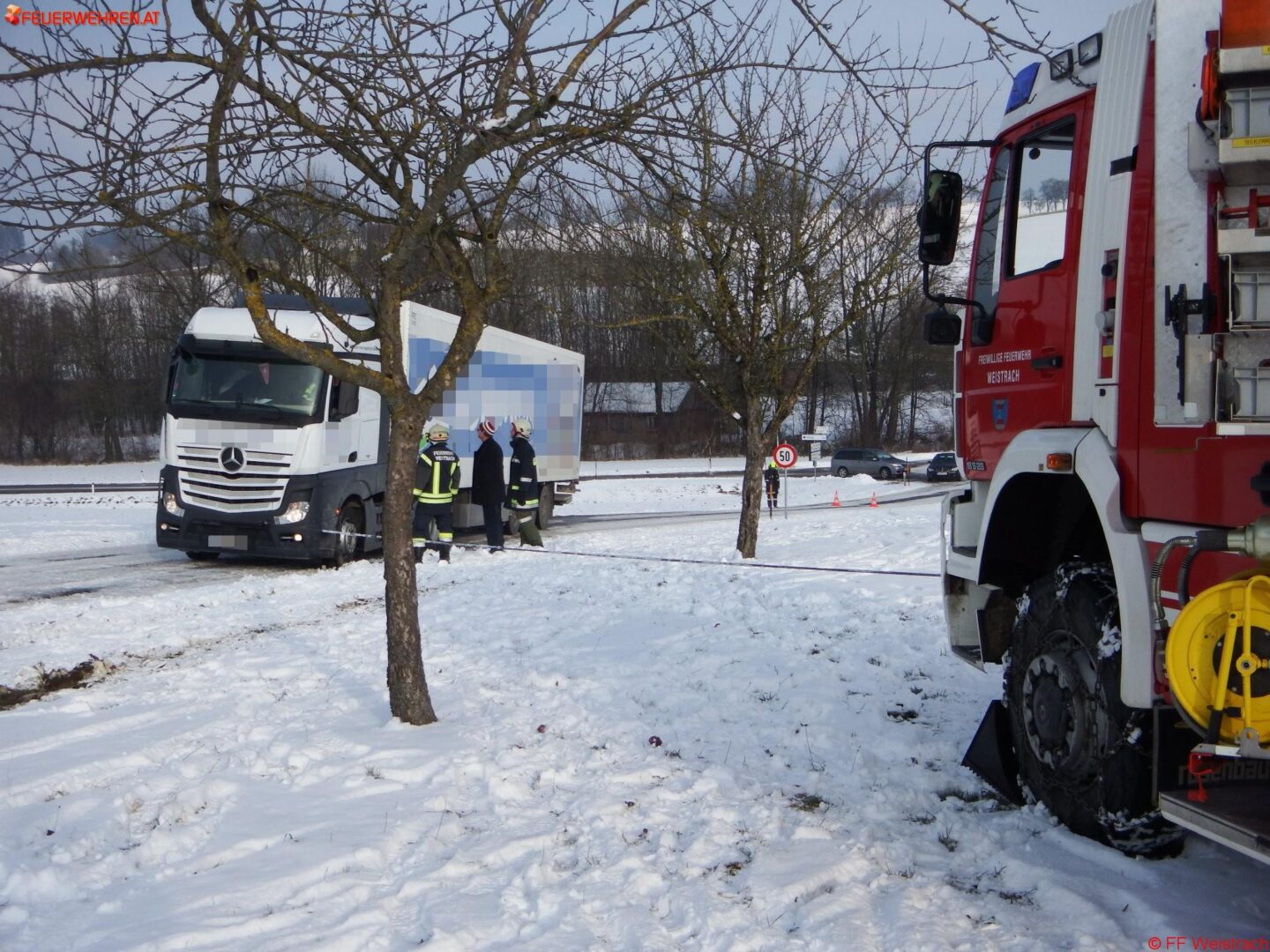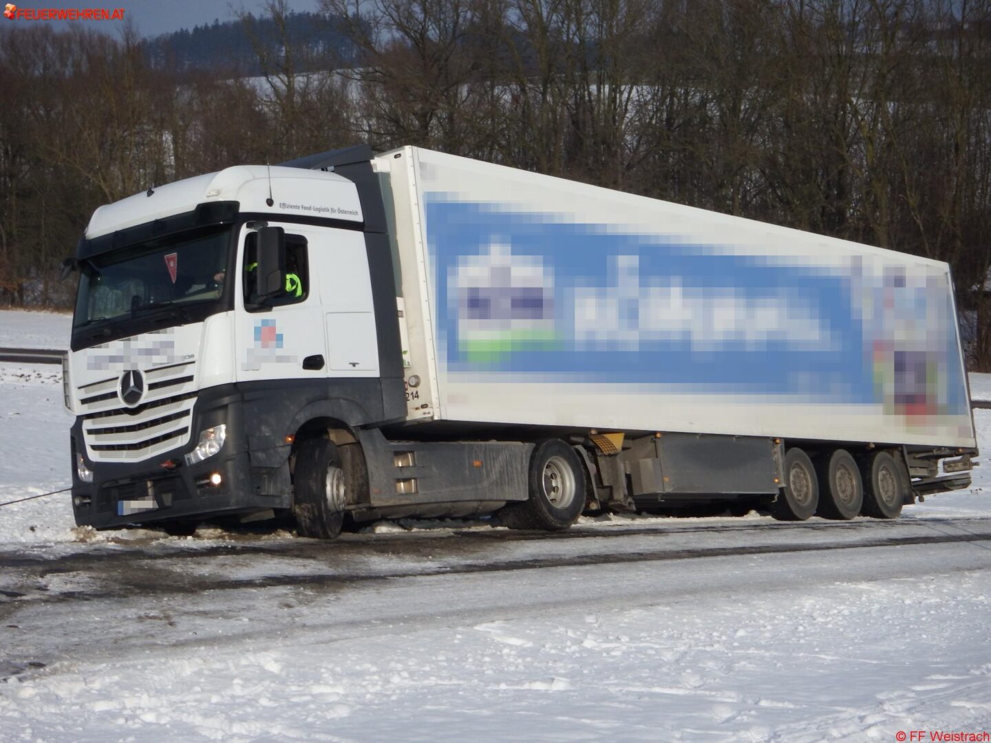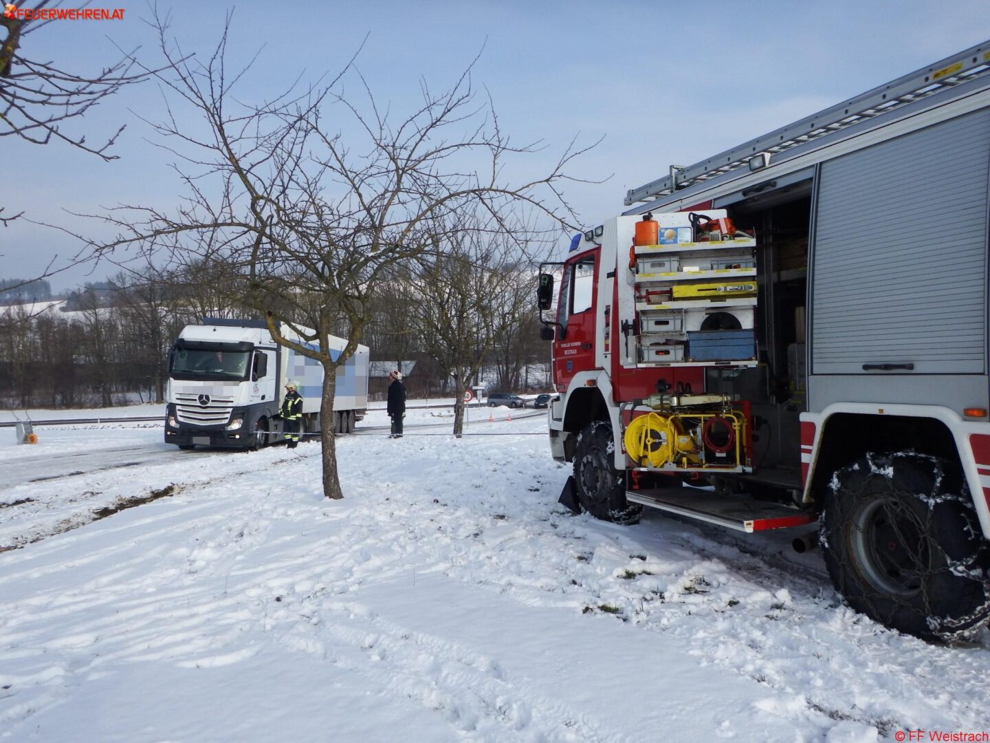 Grund dafür war ein Sattelzug, der von einem steilen Straßenstück abrutschte und seitlich im Straßengraben zu stehen kam. Unter Zuhilfenahme der zwei Seilwinden von HLF 2 Rohrbach und RLFA Weistrach konnte der ca. 16 Tonnen schwere LKW wieder auf die Straße gezogen werden. Während der Bergung musste die Straße gesperrt werden. Danach konnte der LKW Fahrer seine Fahrt fortsetzen.
