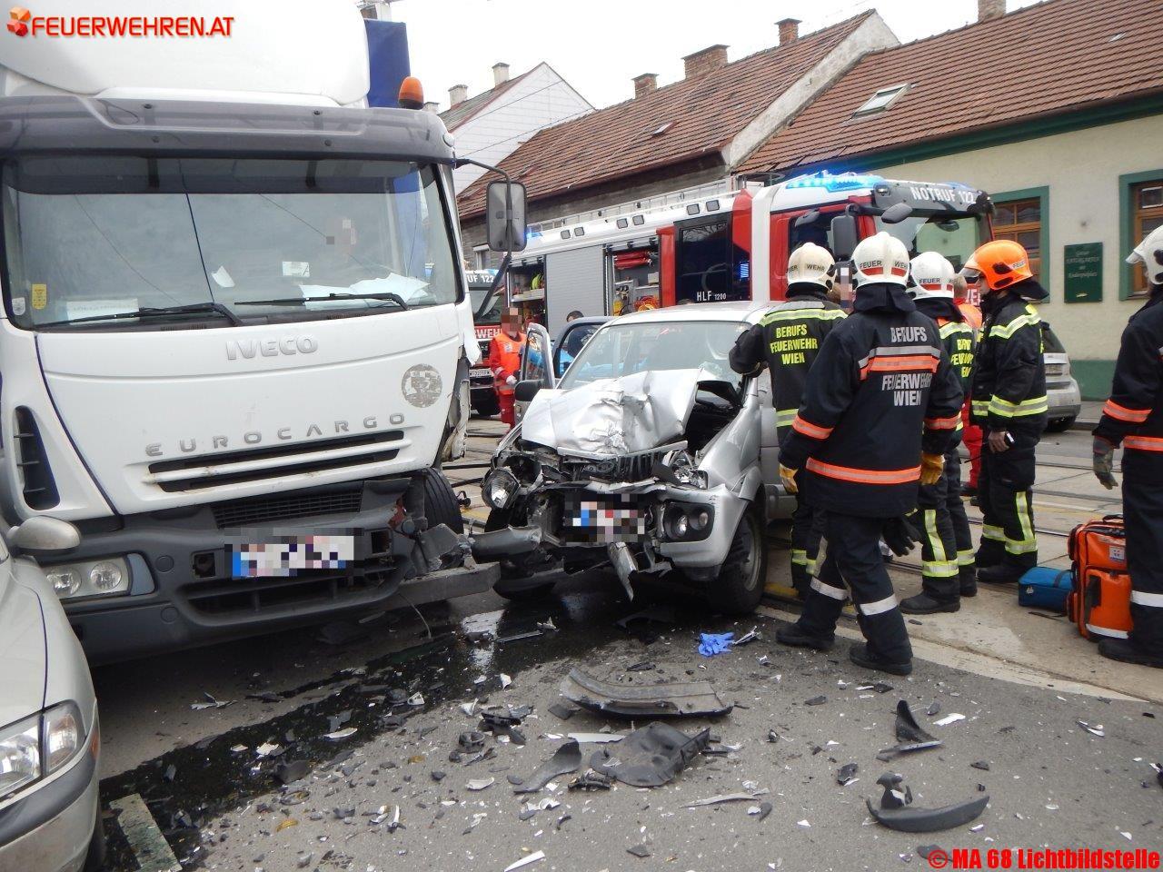 Am 02.02.2016 wurde die BF Wien zu einem Verkehrsunfall zwischen einem PKW und einem LKW gerufen.