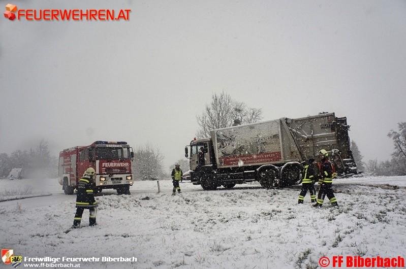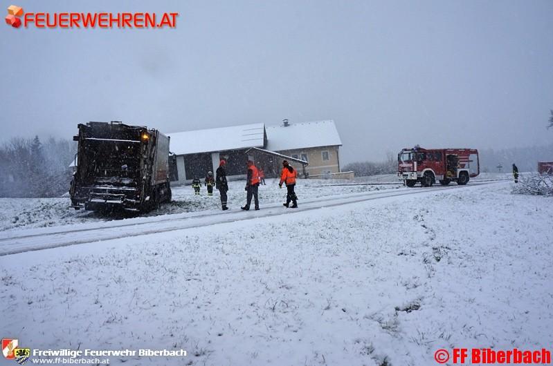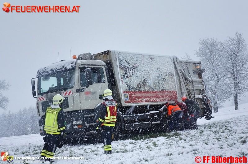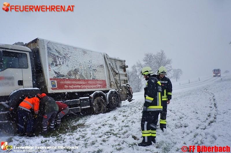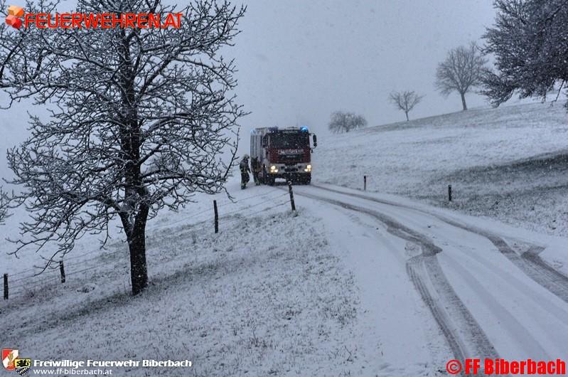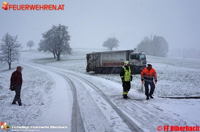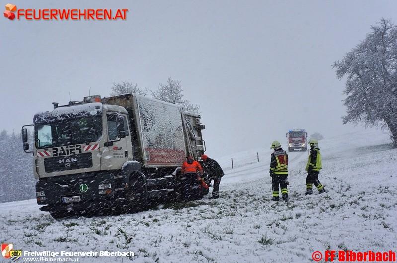 Unmittelbar nach der Alarmierung setzten sich die Einsatzkräfte in Richtung Einsatzort in Bewegung. Die Erkundung des Einsatzleiters ergab folgendes Bild: auf einem Güterweg am Friesenberg, Gemeinde Biberbach, war ein LKW eines Entsorgungsbetriebes auf der schneeglatten Fahrbahn ins Rutschen und in weiterer Folge einer angrenzenden Wiese zu stehen gekommen.