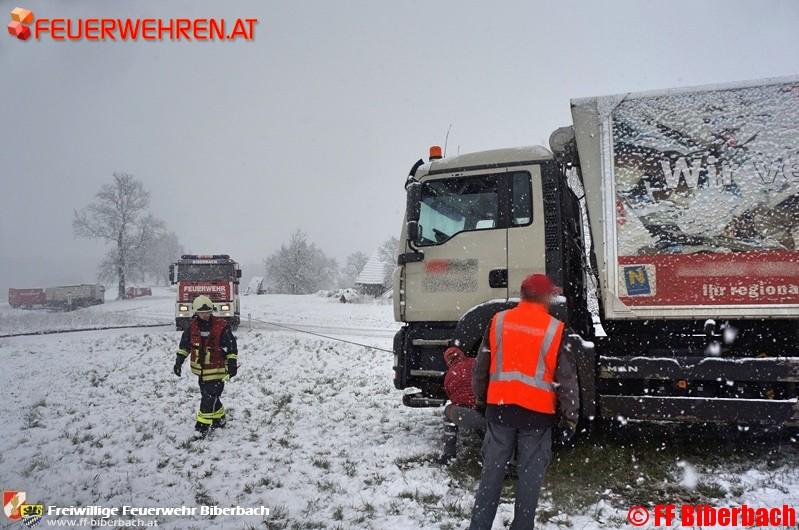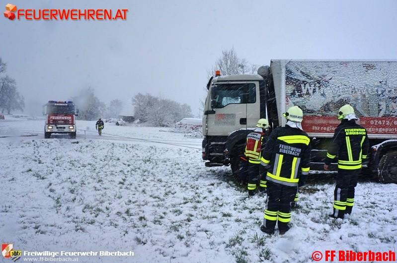 Der plötzliche Wintereinbruch rief am Dienstagvormittag, 15. März 2016, die Feuerwehr Biberbach auf den Plan. Dabei wurden die Mitglieder der Freiwilligen Feuerwehr Biberbach um 8:40 Uhr mit den Alarmstichworten „T1 – LKW-Bergung, LKW steckt in Wiese“ alarmiert.