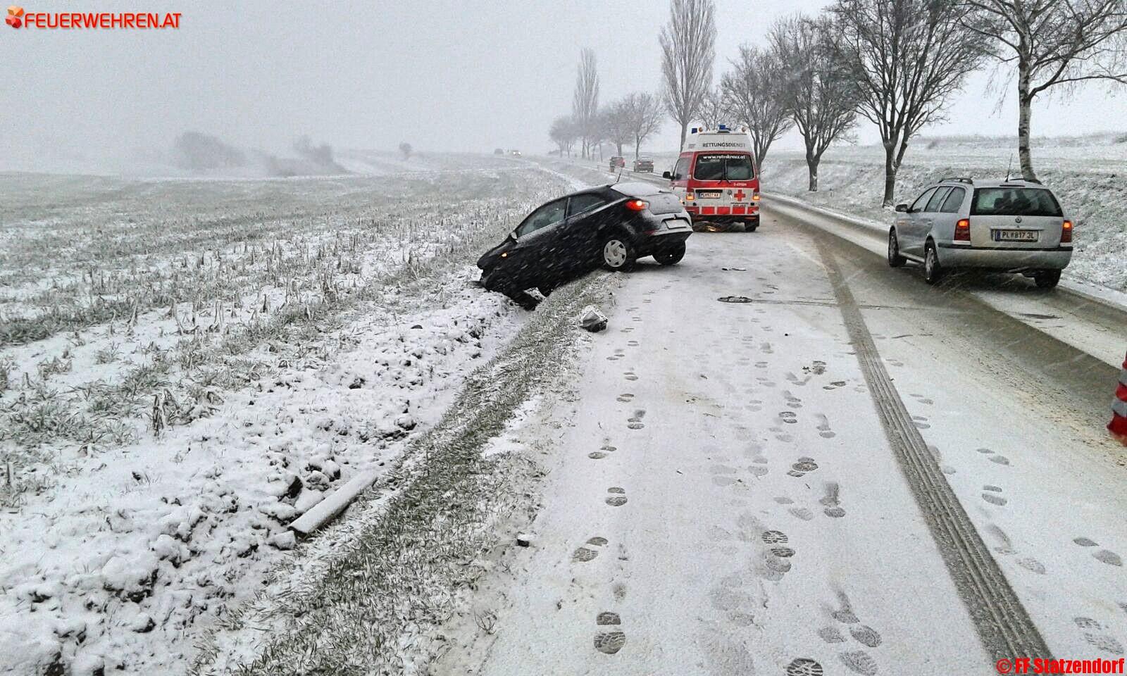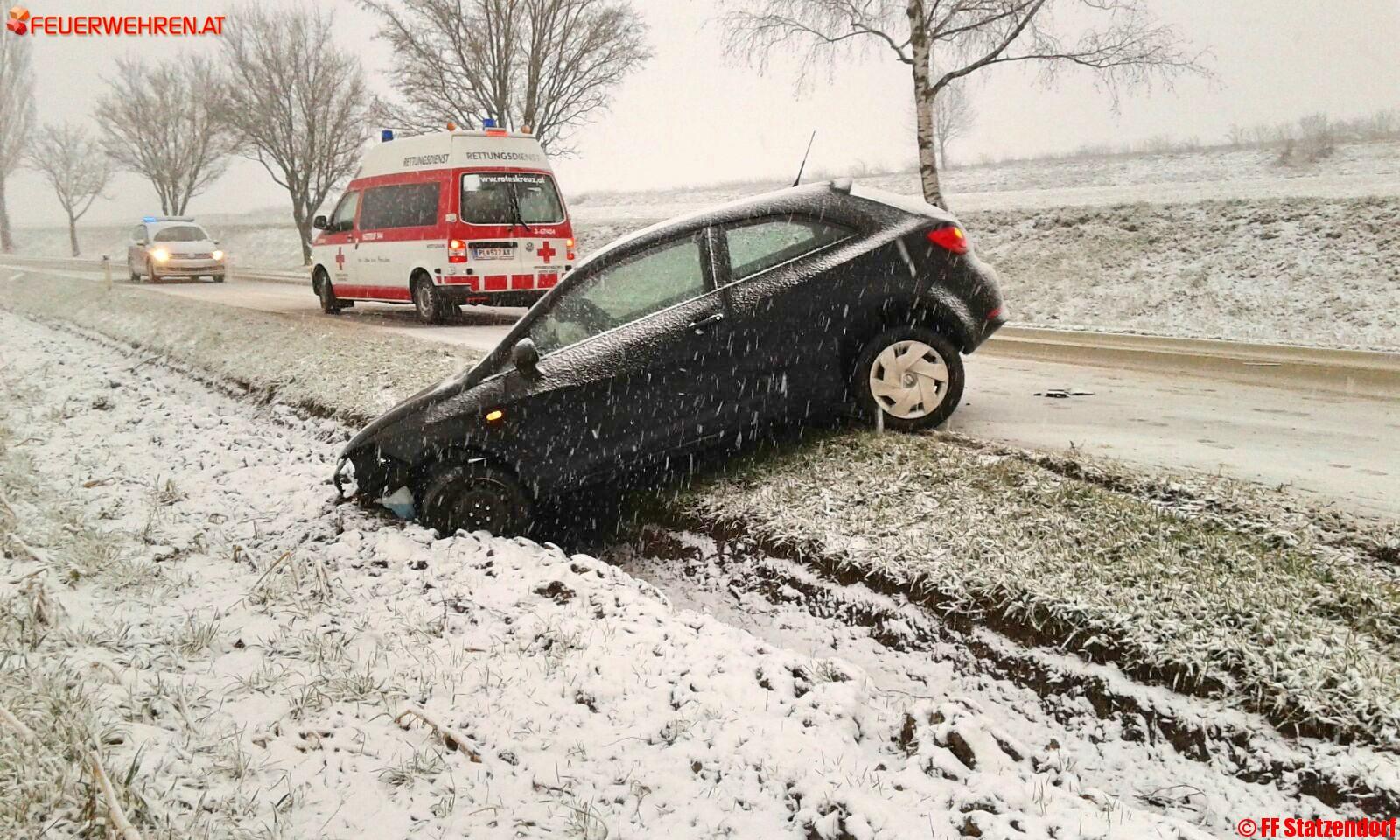Eine Fahrzeuglenkerin geriet aufgrund der Schneefahrbahn ins Schleudern und landete im Straßengraben. Ein Fahrzeug des Roten Kreuzes Herzogenburg kam der leicht Verletzten zu Hilfe und alarmierte weitere Einsatzkräfte.