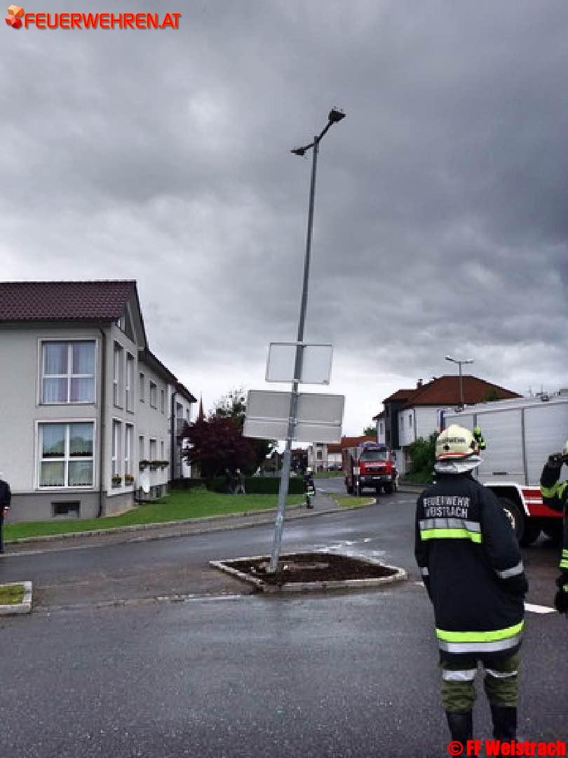 Ein Klein PKW fuhr bei regennasser Fahrbahn auf die Verkehrsinsel und touchierte dabei die Beleuchtung des Kreisverkehrs. Die Lenkerin wurde vom Roten Kreuz erstversorgt und in das LKH Steyr eingeliefert. Die Aufgabe der FF Weistrach beschränkte sich auf die Absicherung der Unfallstelle da der ebenfalls gerufenen ÖAMTC Abschleppdienst bereits vor Ort war.