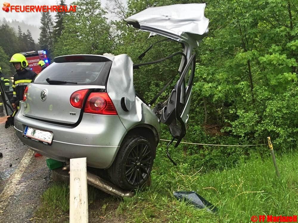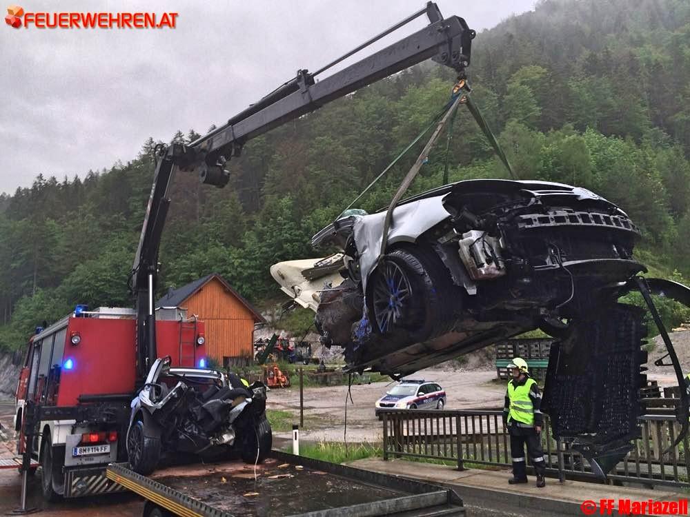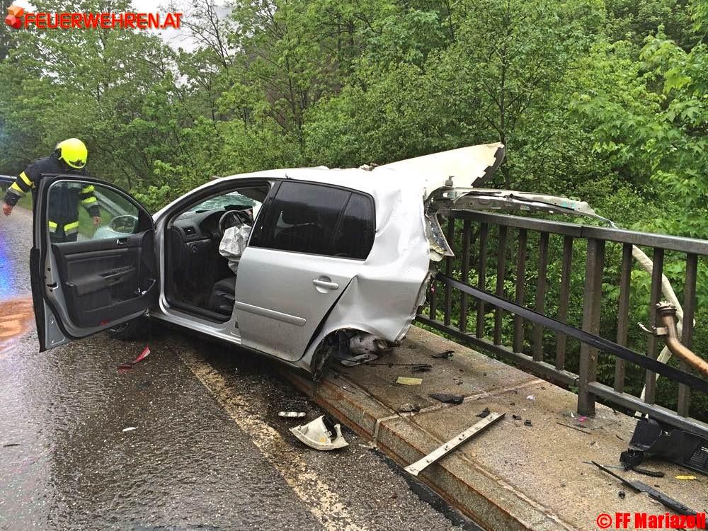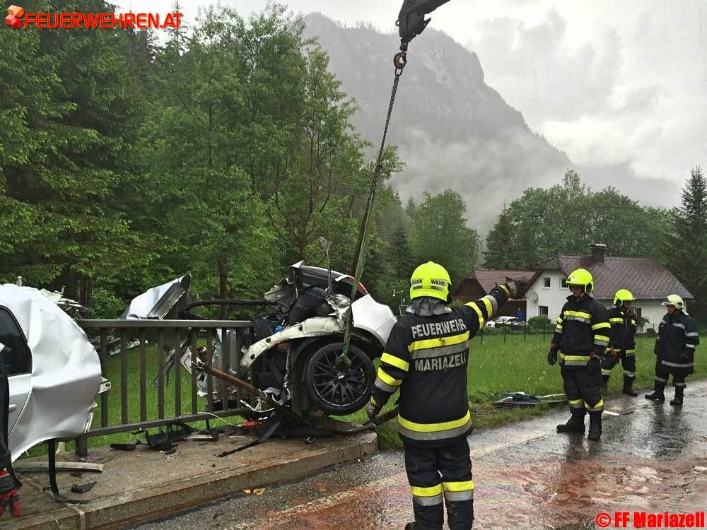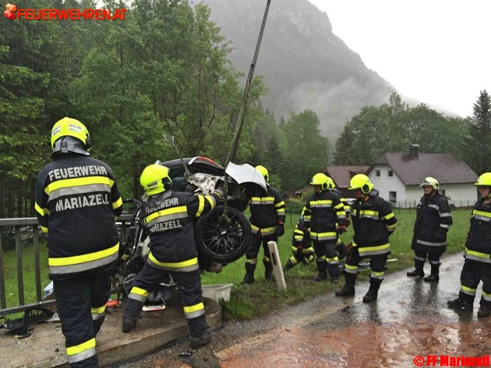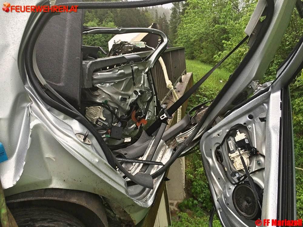 Wirklich von einem Wunder kann man sprechen, wenn nach einem schweren Verkehrsunfall ein PKW gegen ein Brückengeländer knallt, in zwei völlig getrennte Teile zerrissen wird und der Fahrer nahezu unverletzt selber aussteigen kann.Es war für die Einsatzkräfte unglaublich und sehr erfreulich, dass dieser schwere Unfall so glimpflich ausgegangen ist, wenn auch vom Fahrzeug nur ein „Schrotthaufen“ übriggeblieben ist. Die Feuerwehren Gollrad und Mariazell wurden am 2. Juni um 18.32 Uhr zeitgleich von Florian Steiermark zum Verkehrsunfall auf der B 20, km 91,4 in Oberwegscheid alarmiert. Nach der Absicherung der Unfallstelle, dem notwendigen Brandschutz und der Sperre der Bundesstraße, wurde sofort begonnen die ausgelaufenen Treibstoffe mit Ölbindemittel zu binden. Die herumliegenden Teile wurden gesammelt und mit dem LKW nach Mariazell transportiert.