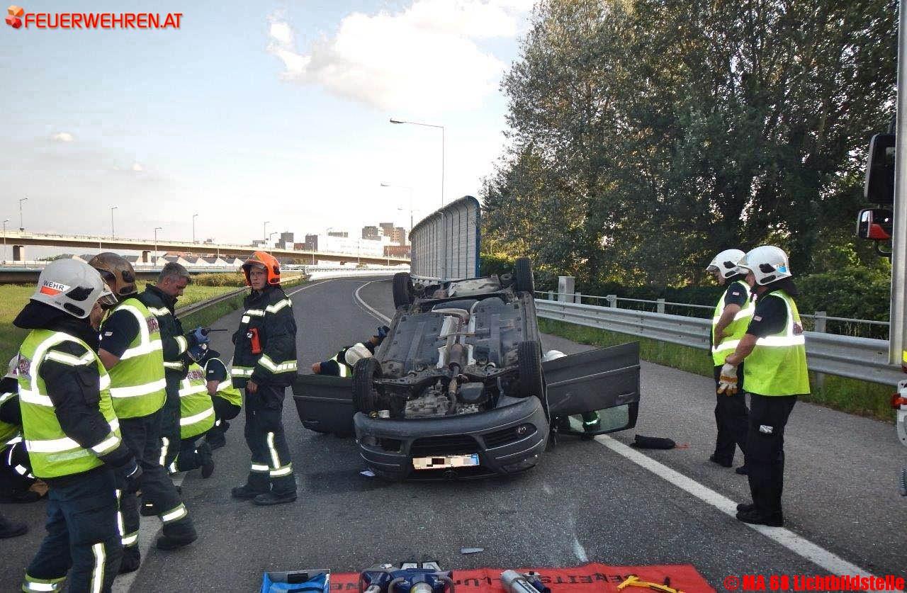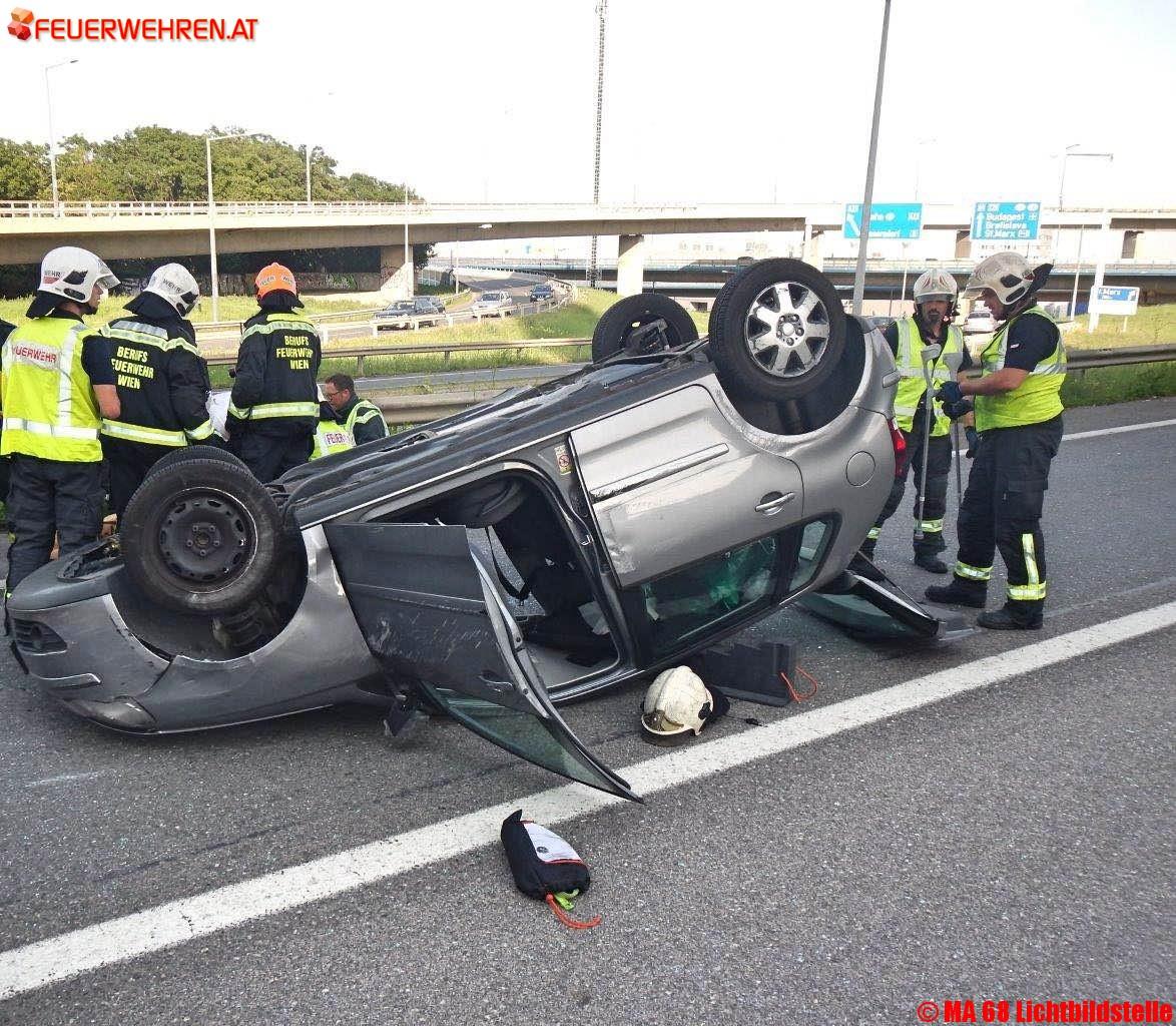 Wien (OTS) – Samstagnachmittag wurde die Berufsfeuerwehr Wien zu einem Verkehrsunfall mit eingeklemmter Person alarmiert. Auf der A23, Auffahrt Gürtel, Fahrtrichtung Süden überschlug sich aus derzeit unbekannter Ursache ein PKW und kam am Fahrzeugdach zu liegen. Die 79-jährige Fahrzeuglenkerin wurde durch den Unfall im Beinbereich eingeklemmt und im Fahrzeug eingeschlossen.