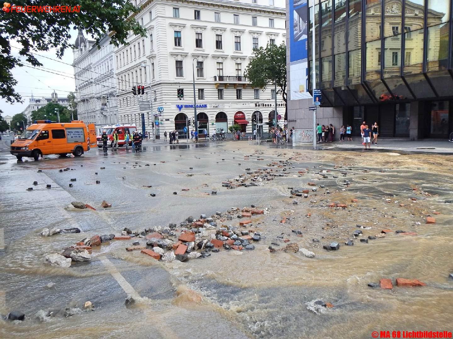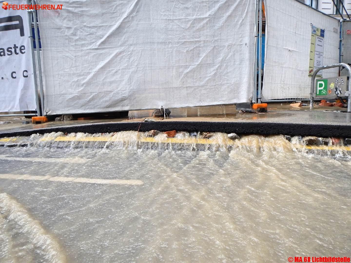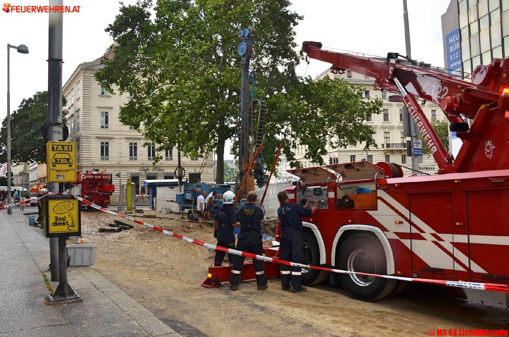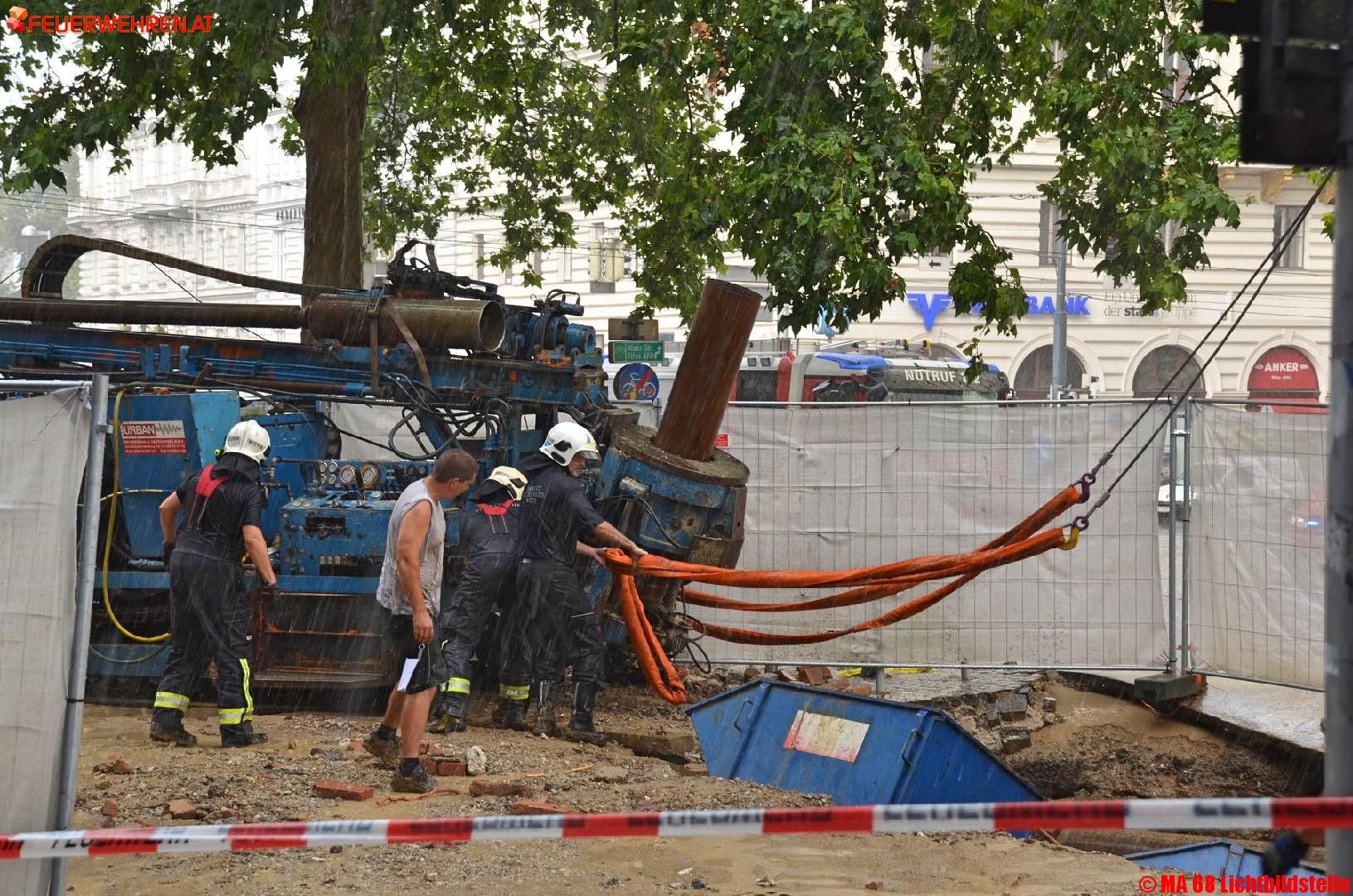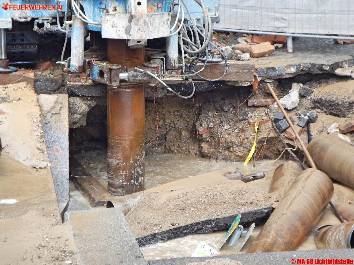 Fotos zum Einsatz „Wasserrohrbruch“ Auerspergstraße/ Josefstädter Straße, sowie der Sicherung und Bergung des Bohrgerätes mittels zweier Feuerwehrkranfahrzeuge.