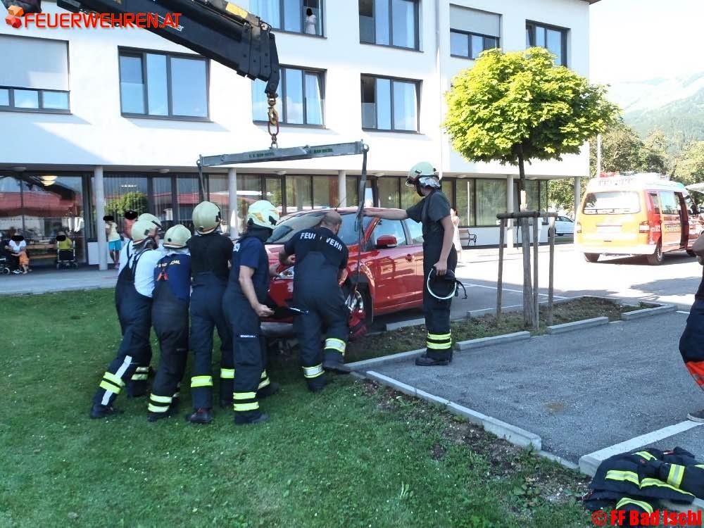 Beim Eintreffen der Feuerwache Reiterndorf wurde bei der Lageerkundung festgestellt, dass eine schonende Fahrzeugbergung am besten mit dem Kran des schweren Rüstfahrzeuges der freiwilligen Feuerwehr Bad Ischl durchgeführt werden kann. Aus diesem Grunde wurde diese nachalarmiert.