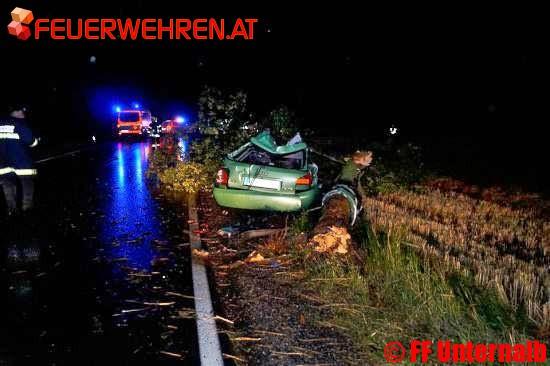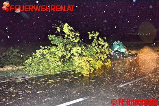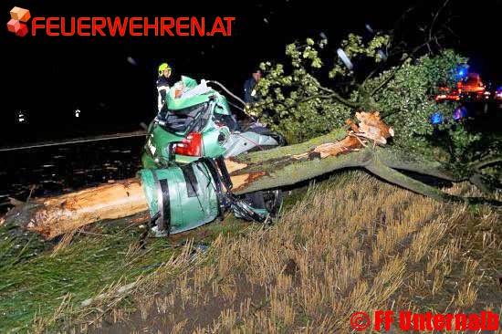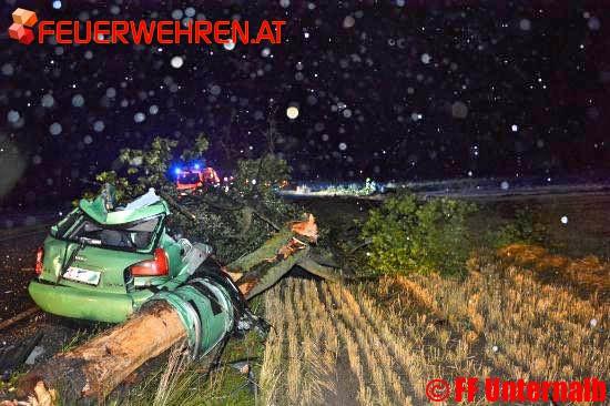 Die Feuerwehr Retz wurde zu einem Verkehrsunfall mit eingeklemmter Person zwischen Retz und Kleinhöflein alarmiert. Nach ersten Erkundungen stellte sich heraus das ein PKW mit einem Baum kollidiert war.