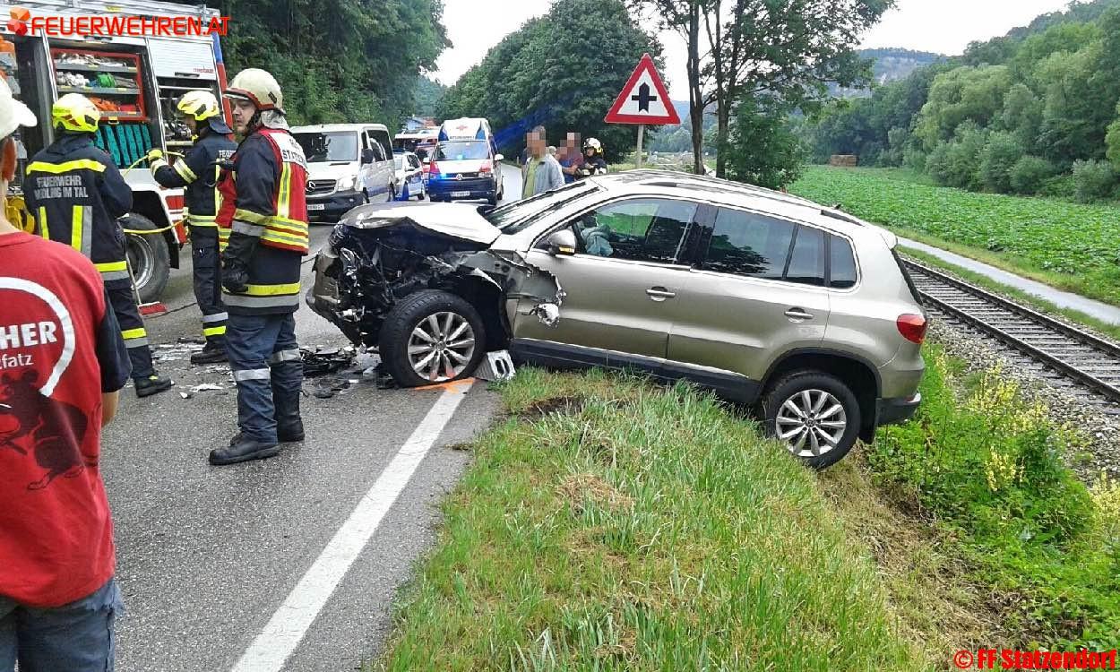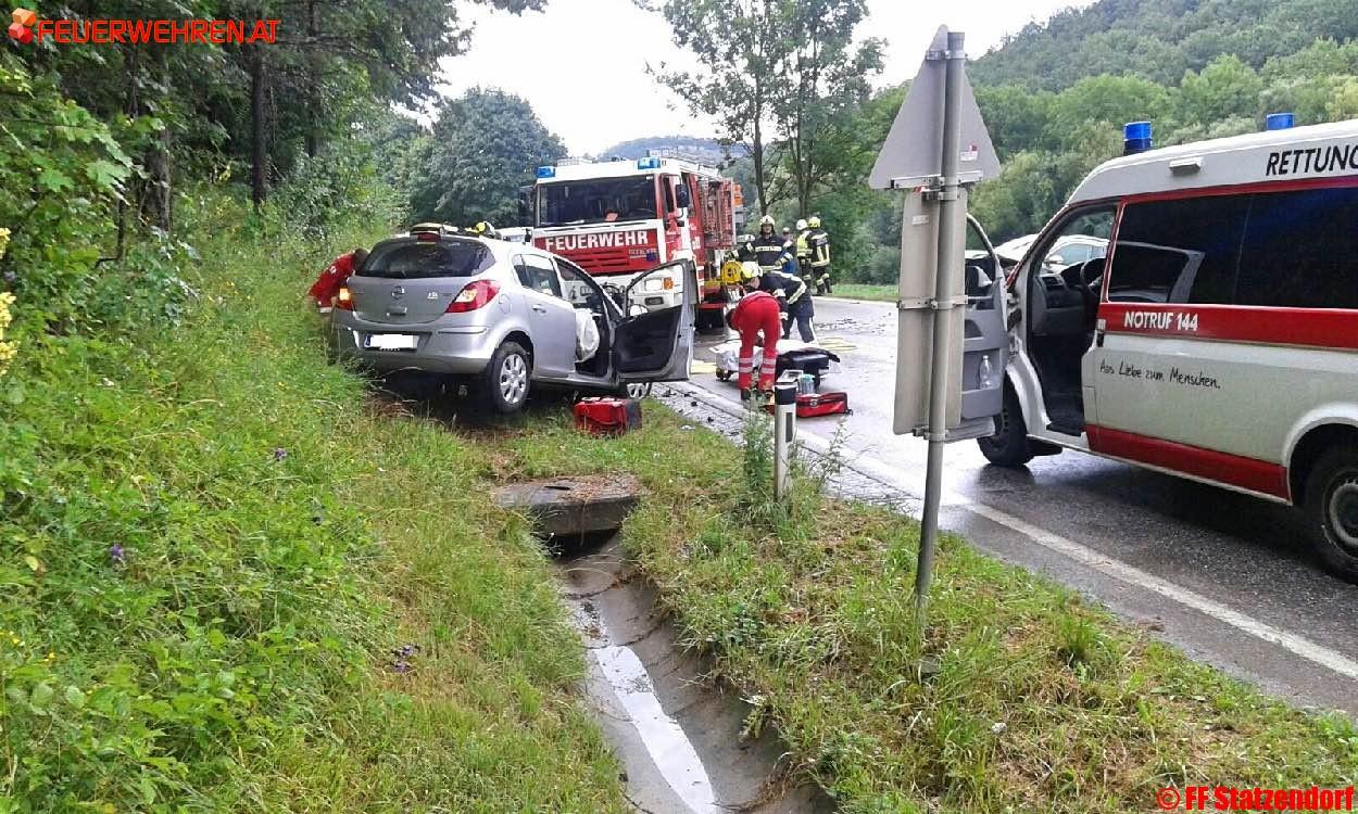 Zwei PKW stießen im Kreuzungsbereich Richtung Unterwölbling aus bisher unbekannter Ursache zusammen. Ein Lenker wurde dabei im Fahrzeug eingeklemmt. Die Freiwillige Feuerwehr Paudorf befreite den Verunfallten mittels hydraulischem Rettungsgerät. Nach der Erstversorgung vor Ort wurde der Patient mit dem Notarzthubschrauber in ein Krankenhaus transportiert.