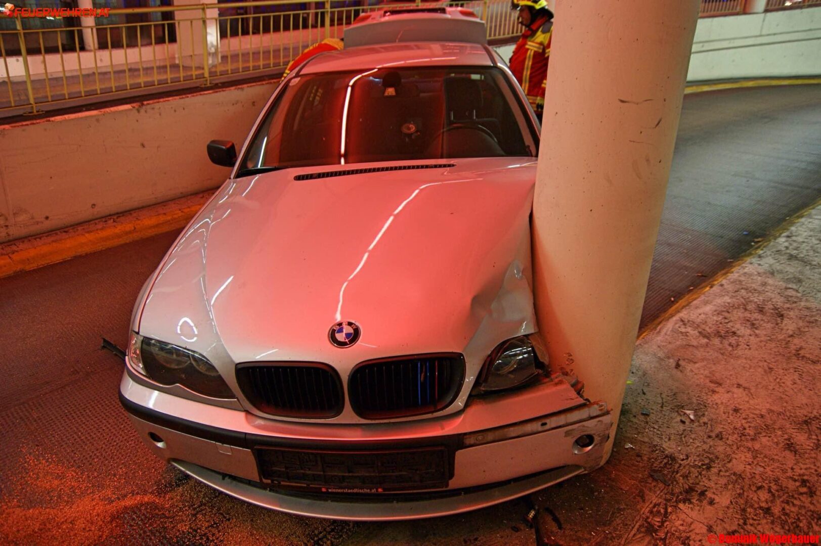 Ein Fahrzeuglenker verlor aus bisher unbekannter Ursache die Kontrolle über sein Fahrzeug und krachte bei der Abfahrt des Parkhauses gegen eine Säule. Der Fahrer wurde bei dem Unfall unbestimmten Grades verletzt und von der Rettung in ein umliegendes Krankenhaus abtransportiert.
