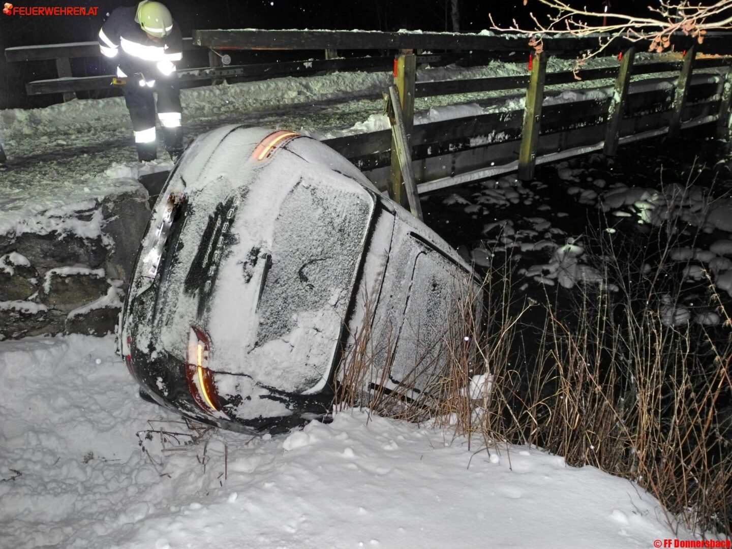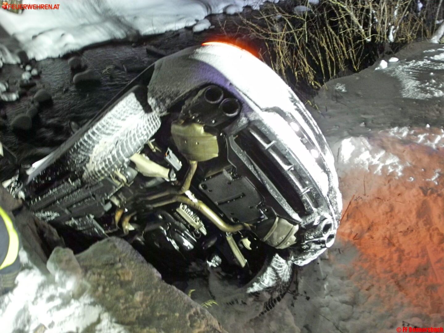 Die Einsatzmannschaft der Feuerwehr Donnersbach wurde am 29.12.2016 um 01:37 mit Sirenenalarm unsanft geweckt „PKW im Bach auf der B75 in Donnersbachwald“ lautete die Einsatzmeldung von der LLZ Steiermark.