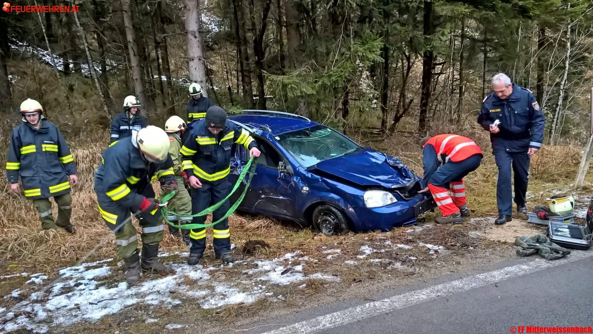 Nach der Versorgung des Verunglückten durch das Rote Kreuz und der Unfallaufnahme durch Beamte der Polizeiinspektion Bad Ischl begannen die Kameraden der FF Mitterweissenbach mit der Fahrzeugbergung. Mittels Seilwinde wurde der PKW wieder auf die Räder gestellt. Um einen Fahrzeugbrand aufgrund eines technischen Defektes zu verhindern wurde die Fahrzeugbatterie sofort nach dem das Wrack wieder auf den Rädern stand abgeklemmt.