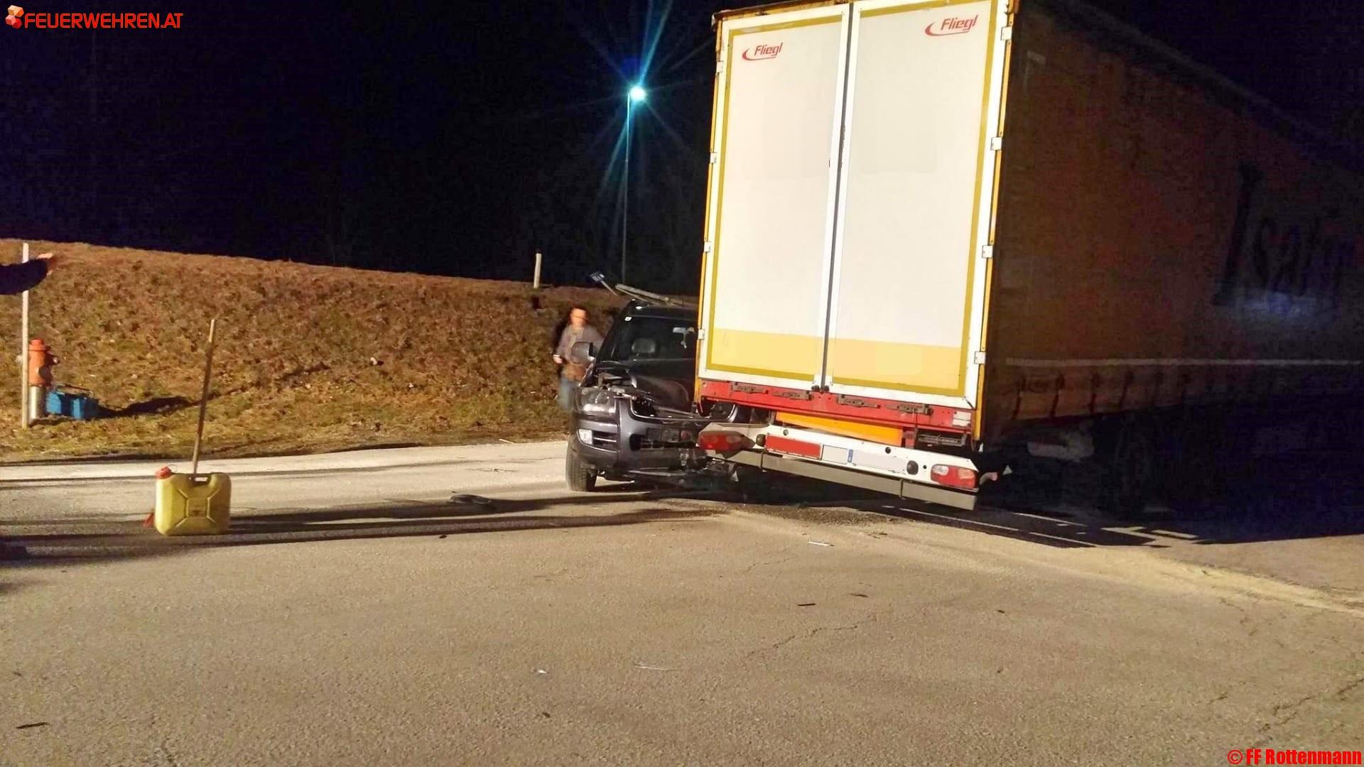 Umgehend rückten wir mit RLFA und TLFA aus. An der Einsatzstelle angekommen stellten wir fest, dass ein PKW von der Straße abgekommen ist und über eine kleine Böschung auf den darunter geparkten LKW stoß.