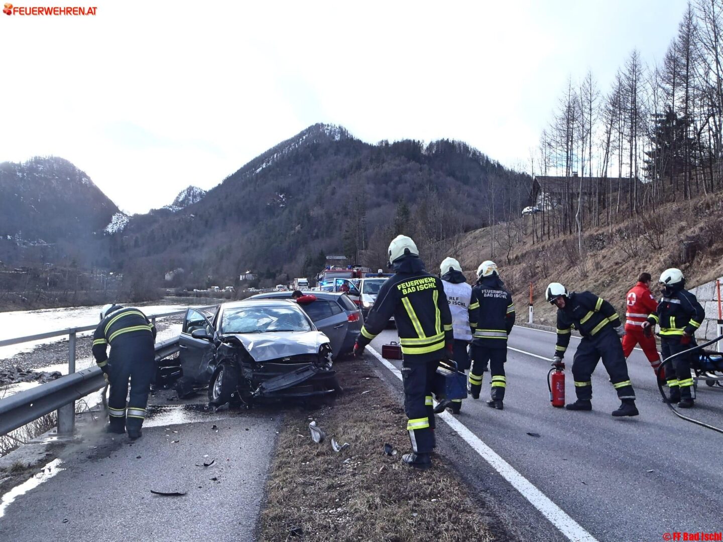 Auf der B145 in Mitterweißenbach kollidierten heute Nachmittag drei Personenkraftfahrzeuge miteinander. Um 15:23 Uhr wurden die Kameraden der Freiwilligen Feuerwehren Mitterweißenbach, Bad Ischl und Pfandl mit folgender Einsatzmeldung von der OÖ Landeswarnzentrale alarmiert: „B145 Kreuzung Mitterweißenbach, VU mit eingeklemmter Person“.