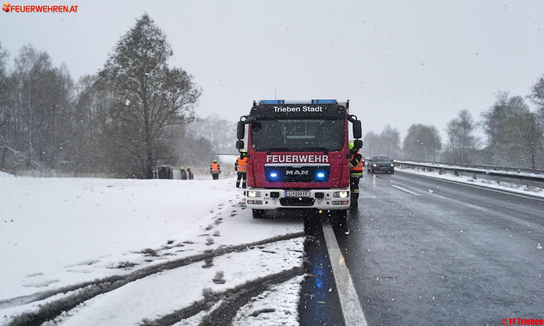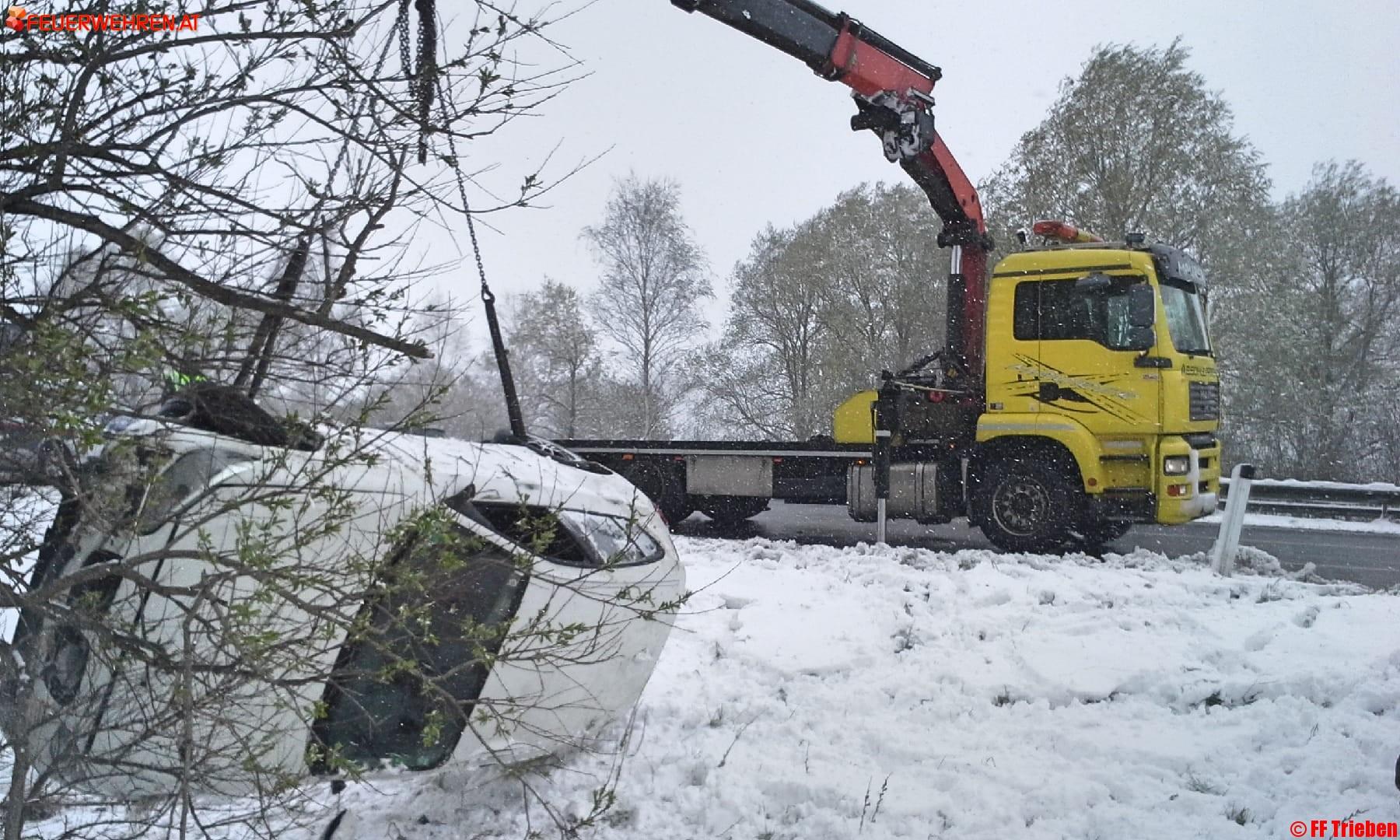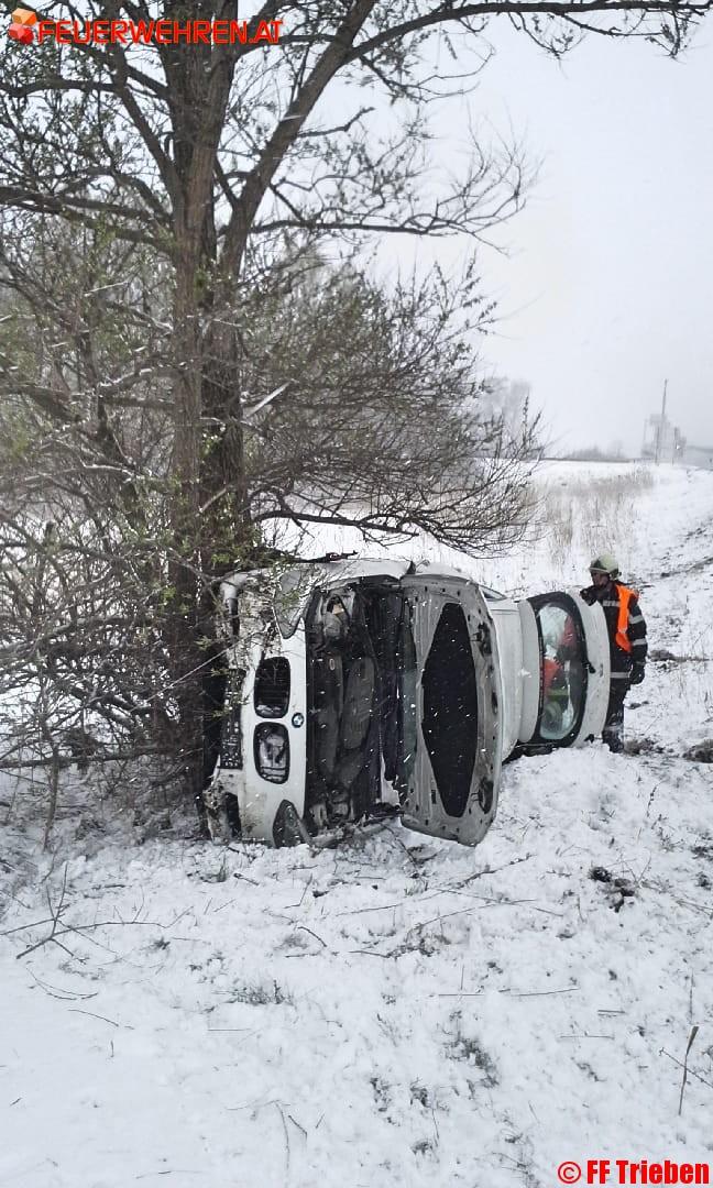 Am 19.04.2017 um 11:43h wurde die Feuerwehr Trieben zu einem Verkehrsunfall mit eingeklemmter Person auf die A9 alarmiert. Bei der Autobahnausfahrt Trieben kam aus bisher unbekannter Ursache der Lenker des Fahrzeuges von der Fahrbahn ab und kam auf der Seite zu liegen.