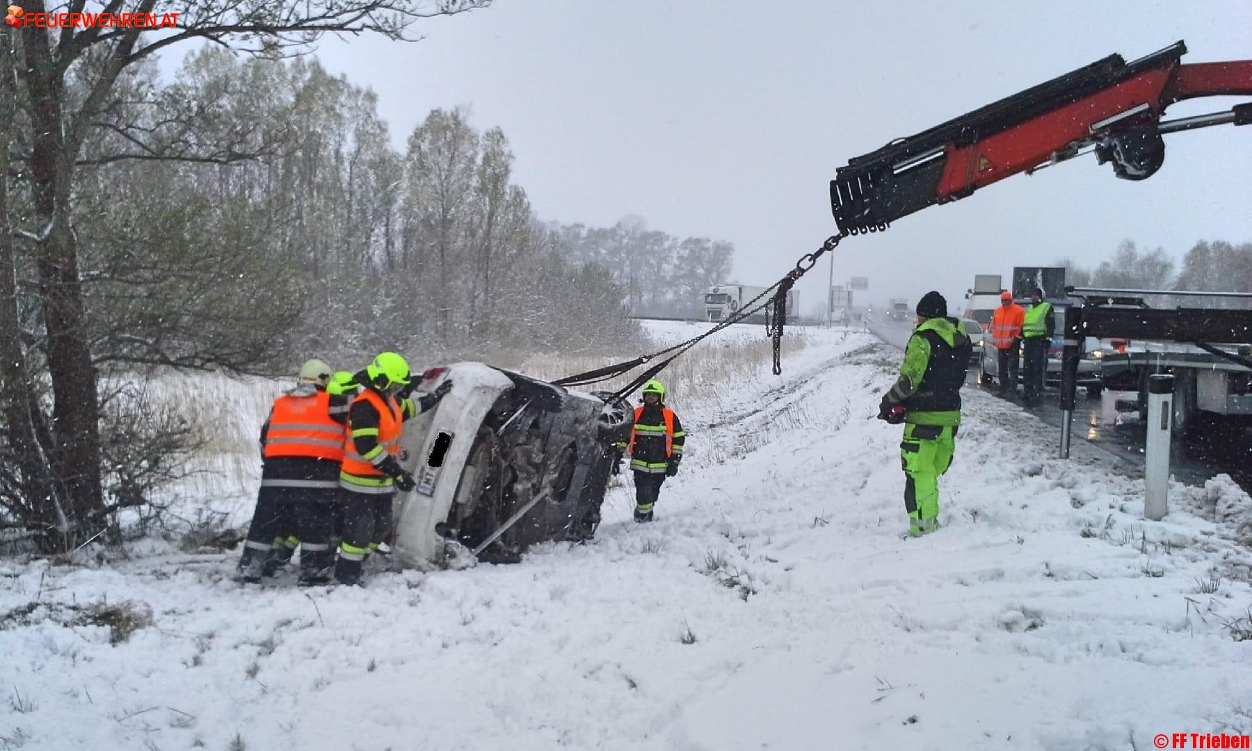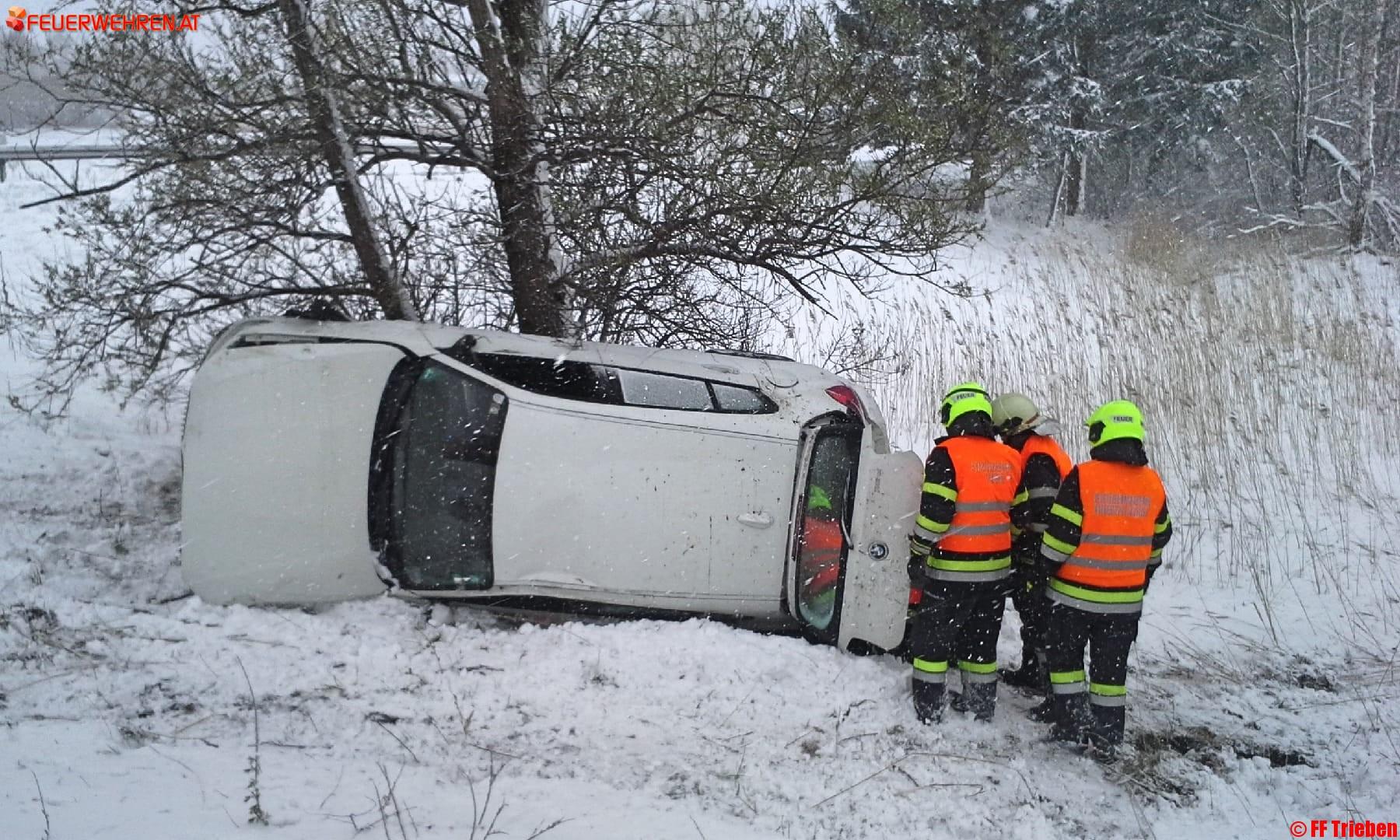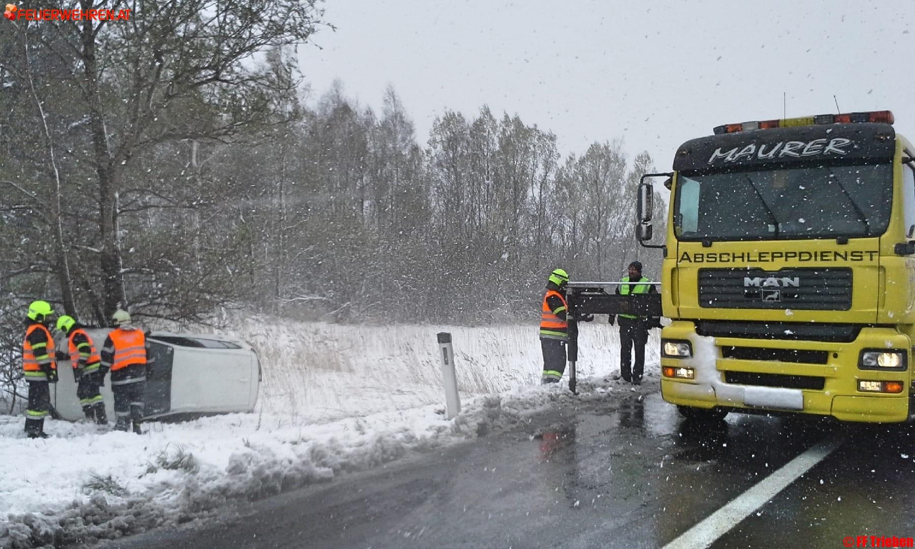 Am 19.04.2017 um 11:43h wurde die Feuerwehr Trieben zu einem Verkehrsunfall mit eingeklemmter Person auf die A9 alarmiert. Bei der Autobahnausfahrt Trieben kam aus bisher unbekannter Ursache der Lenker des Fahrzeuges von der Fahrbahn ab und kam auf der Seite zu liegen.
