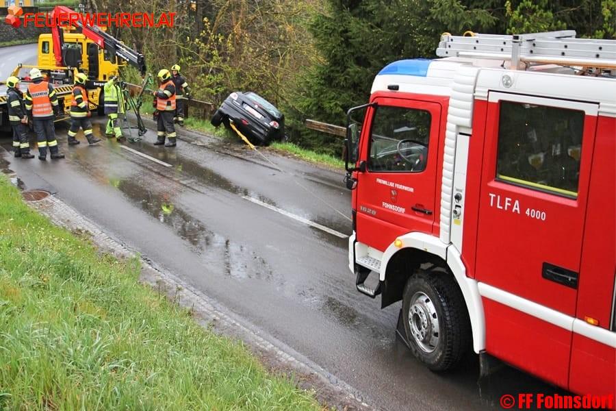 Die angerückte Feuerwehr Fohnsdorf, unter Leitung von Kommandantstellvertreter Uwe Wintschnig, sicherte die Unfallstelle ab, errichtete einen Brandschutz und sicherte den PKW gegen den Absturz. Ein professionelles Abschleppunternehmen barg mittels Kran das fahruntüchtige Fahrzeug. Erfreulicherweise blieb die Fahrerin bei diesem Zwischenfall unverletzt.