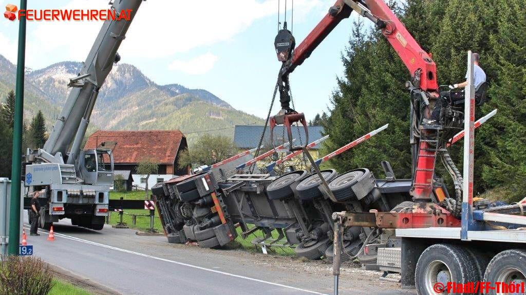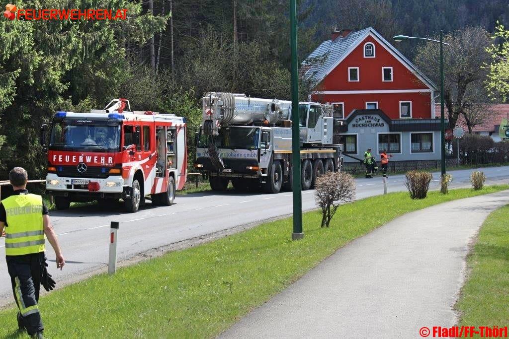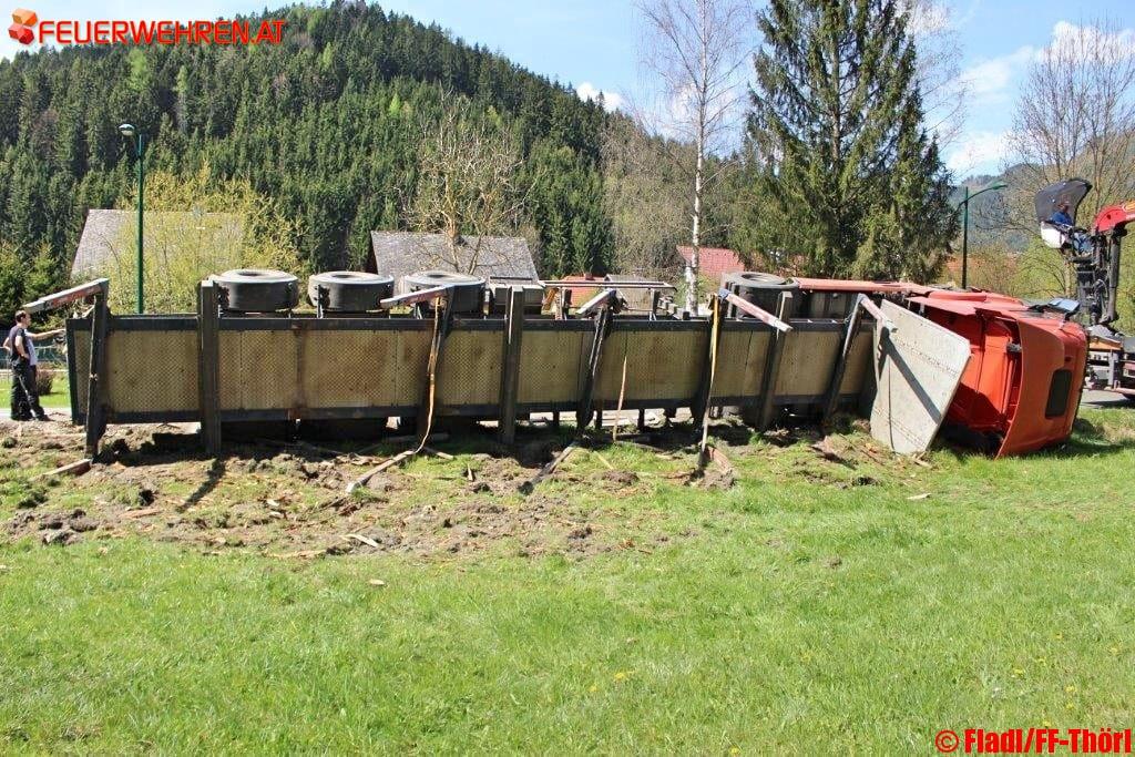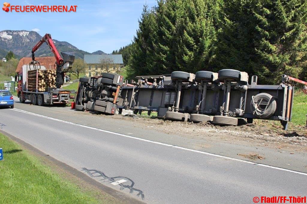 Ein schwerer Verkehrsunfall ereignete sich am Dienstag, den 25. April 2017, gegen 10:40 Uhr. Ein Holztransporter kam aufgrund bislang unbekannter Ursache auf das Straßenbankett und stürzte anschließend in eine Wiese.Die Kameraden der Freiwilligen Feuerwehr Thörl rückten nach der Alarmierung auf die Mariazellerbundesstraße aus, wo sofort ein doppelter Brandschutz aufgebaut und die Unfallstelle abgesichert wurde.