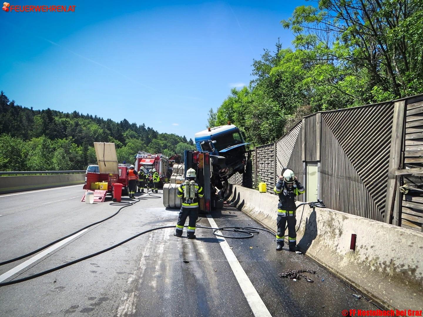 Wenige Minuten nach der Alarmierung traf die erste Löschgruppe am Einsatzort auf der Südautobahn ein, Ersthelfer gelang es das Ausbreiten des Brandes mit Feuerlöschern zu verhindern, der Atemschutztrupp des Rüstlöschfahrzeuges 2000-300 konnte den Brand unter Vornahme des Hochdruckrohres sofort löschen und „Brand aus“ geben. Die restliche Mannschaft sicherte die Einsatzstelle großräumig ab und begann mit dem Binden der ausgeflossen Betriebsmittel. Zur weiteren Unterstützung wurde die Feuerwehr Gleisdorf mit dem Ölschadensfahrzeug und schweren Rüstfahrzeug nachalarmiert. Da der Dieseltank stark beschädigt wurde und der Treibstoff sich großräumig verteilte, wurde der Chemiealarmdienst des Landes Steiermark angefordert. Auf Anweisung des Chemiealarmdienstes musste kontaminiertes Erdreich im Leitschienenbereich ausgeschaufelt werden.