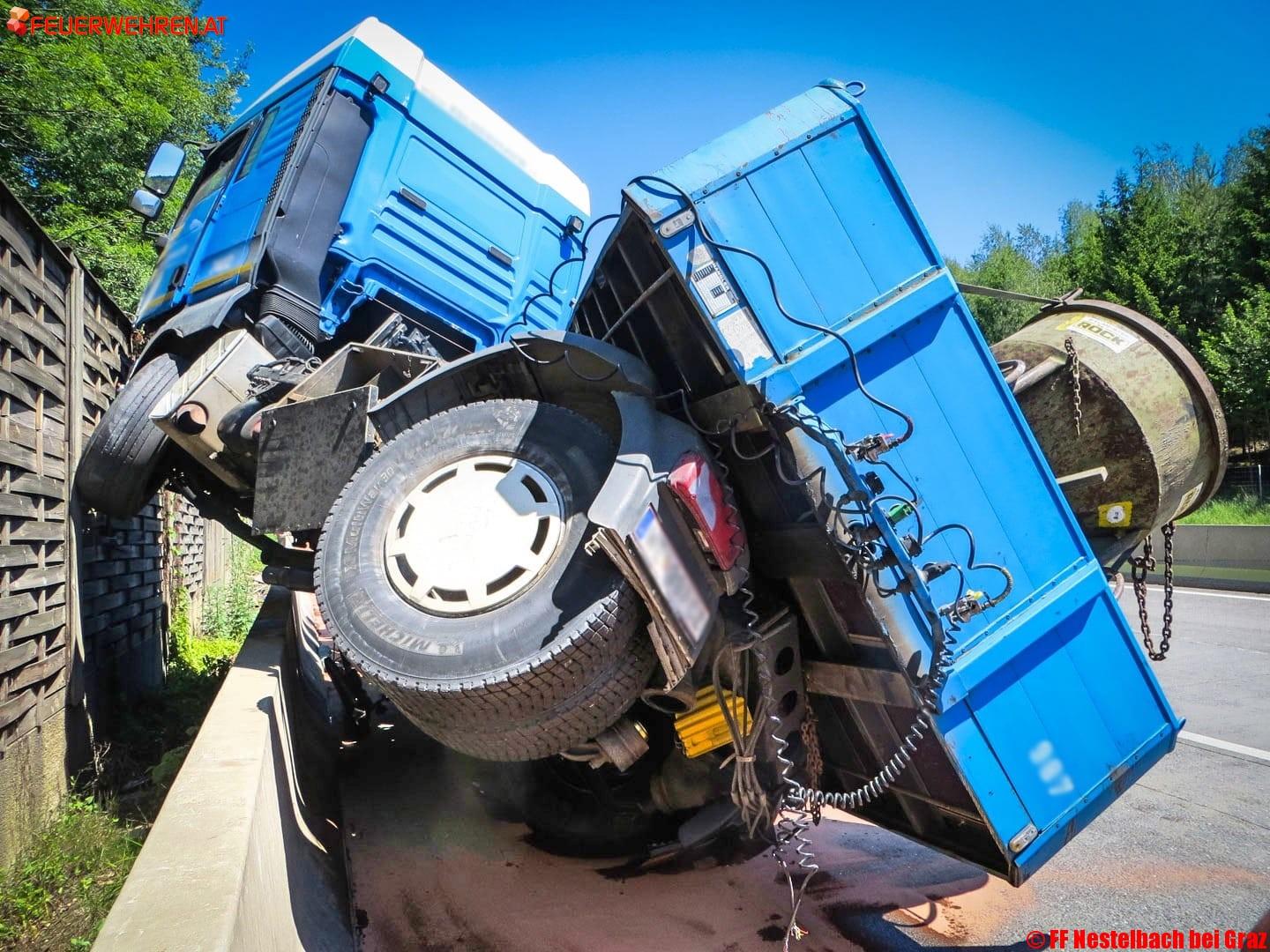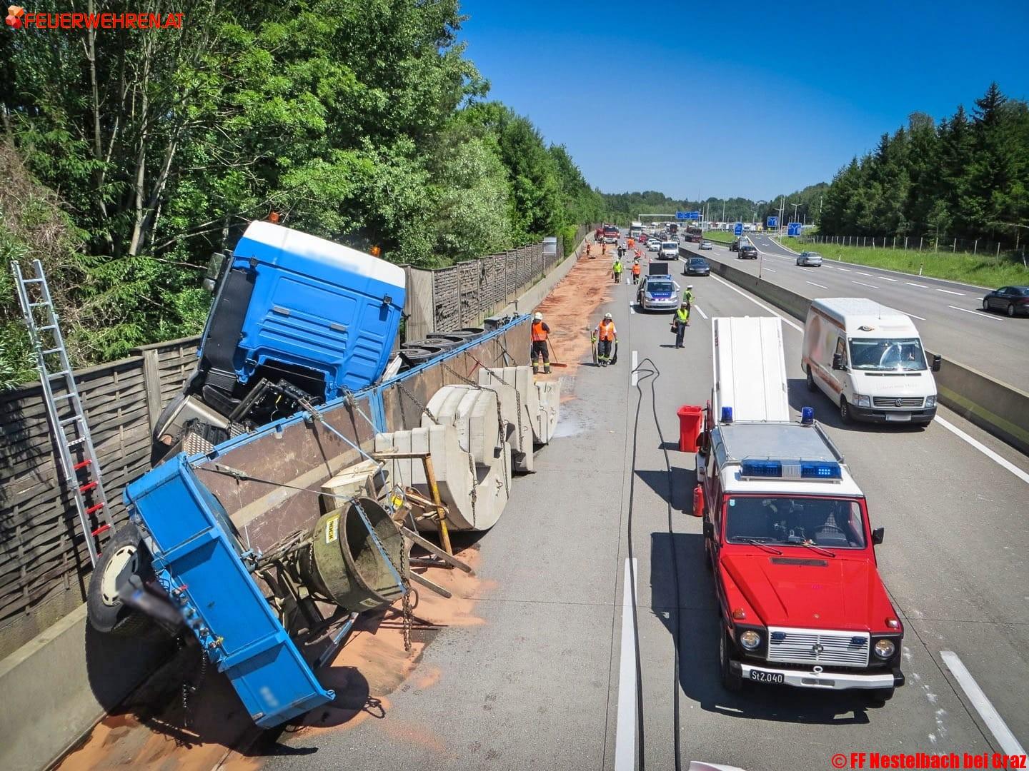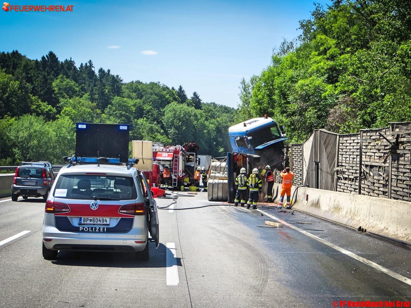 Montagmittag kam es auf der A2 Südautobahn zu einem folgenschweren LKW – Unfall. Der Lenker des Sattelzuges verlor aus bisher ungeklärter Ursache die Kontrolle über seinen LKW – Zug, dabei schleuderte der Sattelzug, beladen mit tonnenschweren Betonteilen, kurz nach dem Asfinag Parkplatz Laßnitzhöhe Nord über die Fahrbahn der Südautobahn.