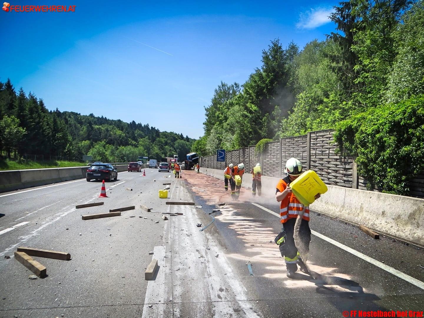 Die Feuerwehr Nestelbach bei Graz stand unter der Einsatzleitung von Brandmeister Ing. Tobias Mara mit drei Fahrzeugen und 19 Mann auf der A2 Südautobahn über sechs Stunden im Einsatz.