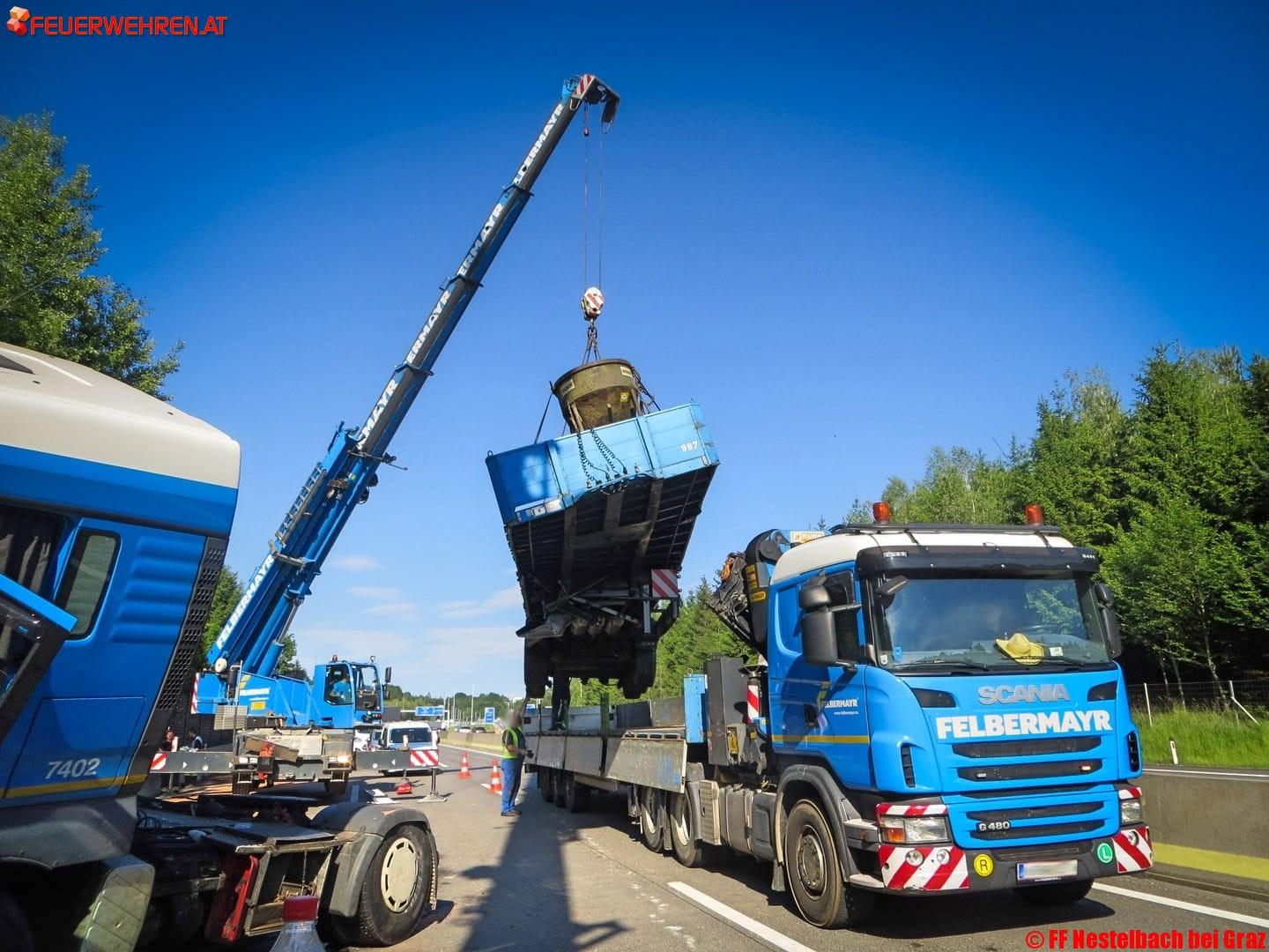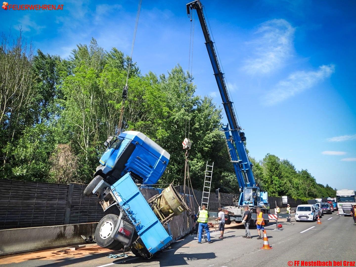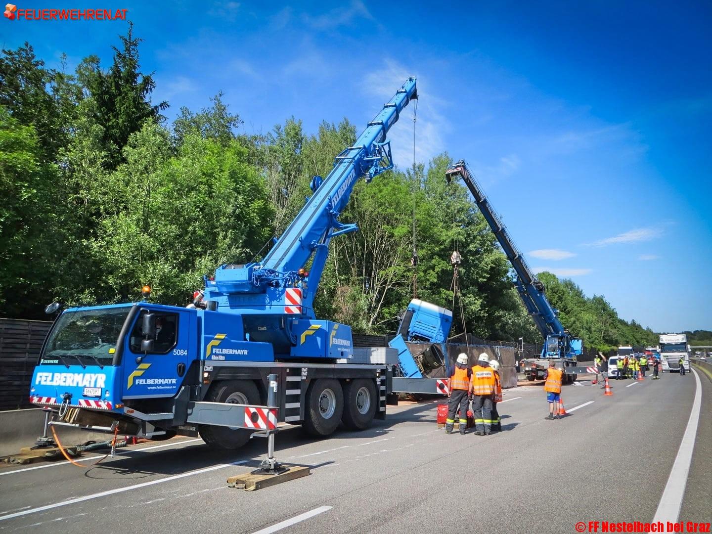 Für die Bergearbeiten am LKW – Sattelzug mussten zwei Bergekräne der Firma Felbermayer hinzugezogen werden, bevor mit der Bergung des Sattelzuges begonnen werden konnte, mussten zunächst die Betonteile umgeladen werden, danach konnte erst der Sattelzug zurück auf die Fahrbahn gehoben werden. Während der Bergungsarbeiten mussten die restlichen circa 500 Liter Dieselkraftstoff, welche sich noch im aufgebrochenen Dieseltank befanden, abgepumpt werden. Der verunfallte Sattelzug wurde mit weiteren Sattelzügen der Firma Felbermayer abtransportiert, während der Bergungsarbeiten musste die A2 Südautobahn im Bereich der Unfallstelle komplett gesperrt werden.
