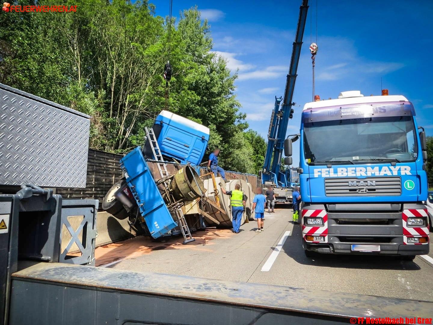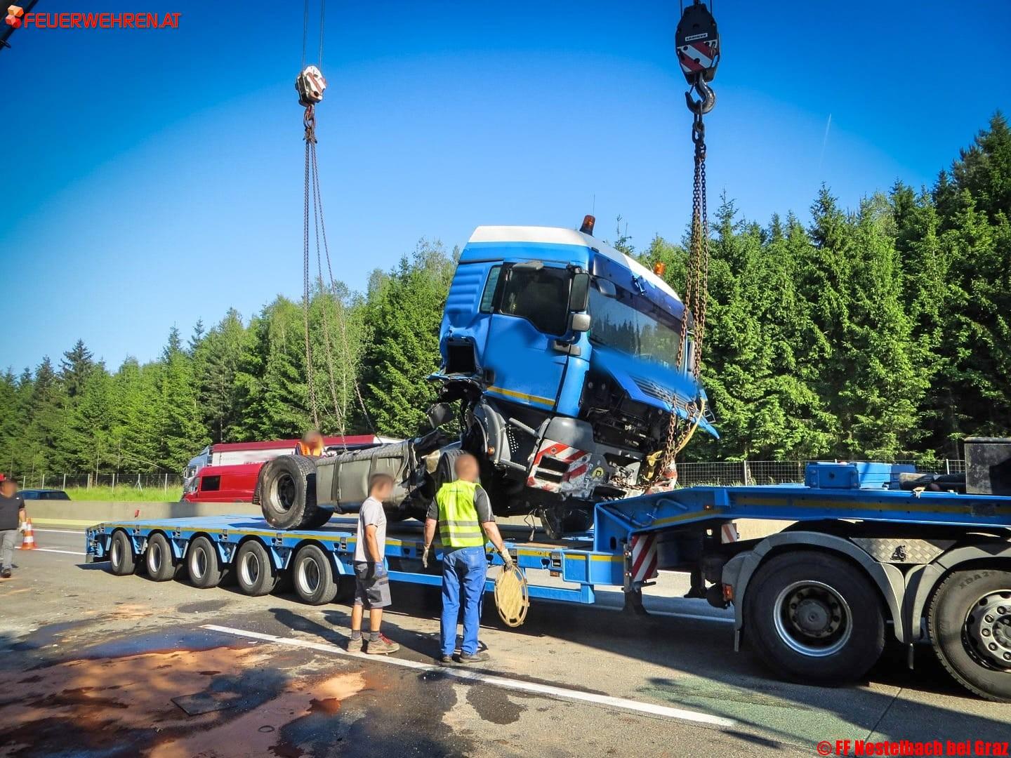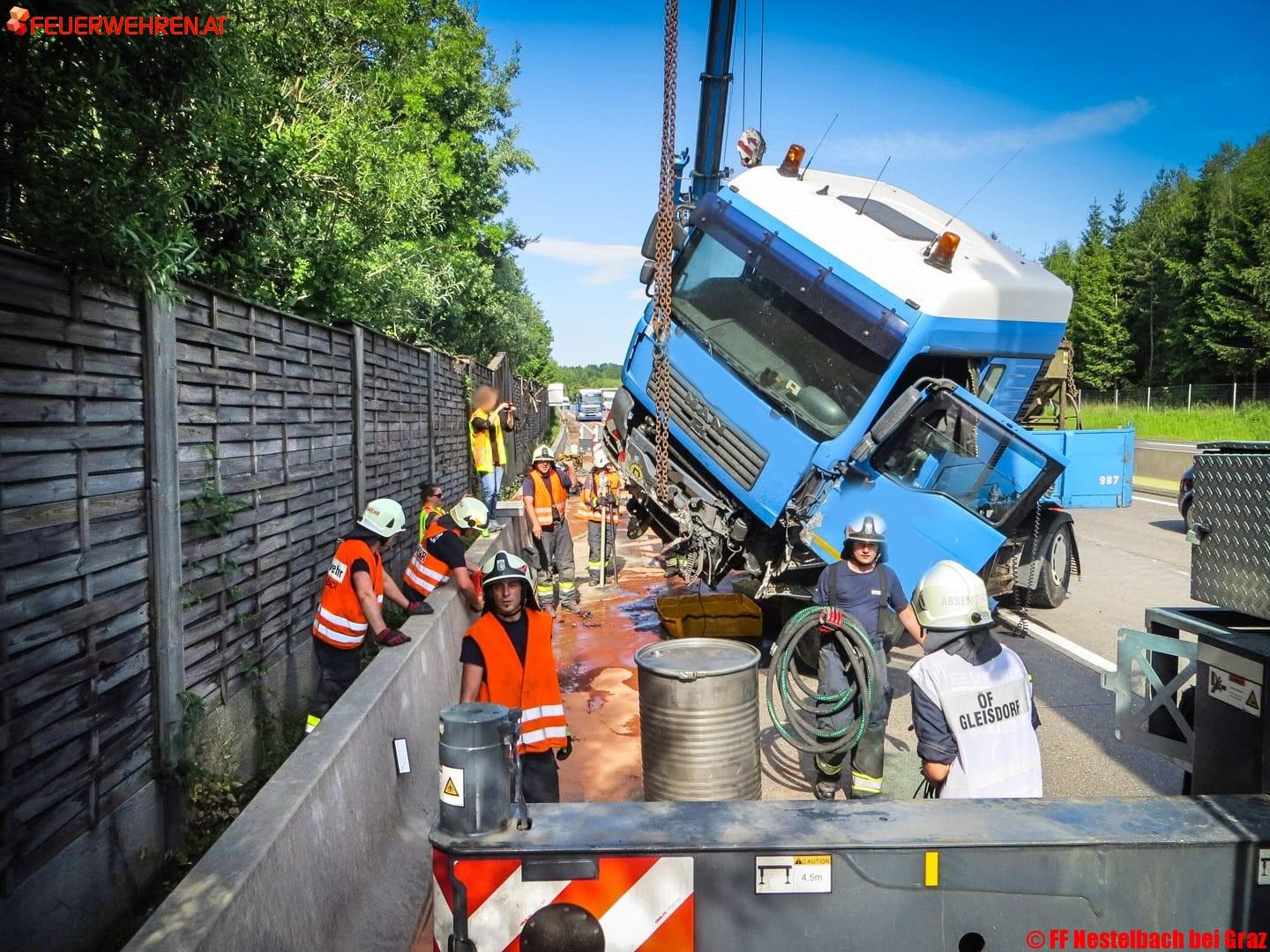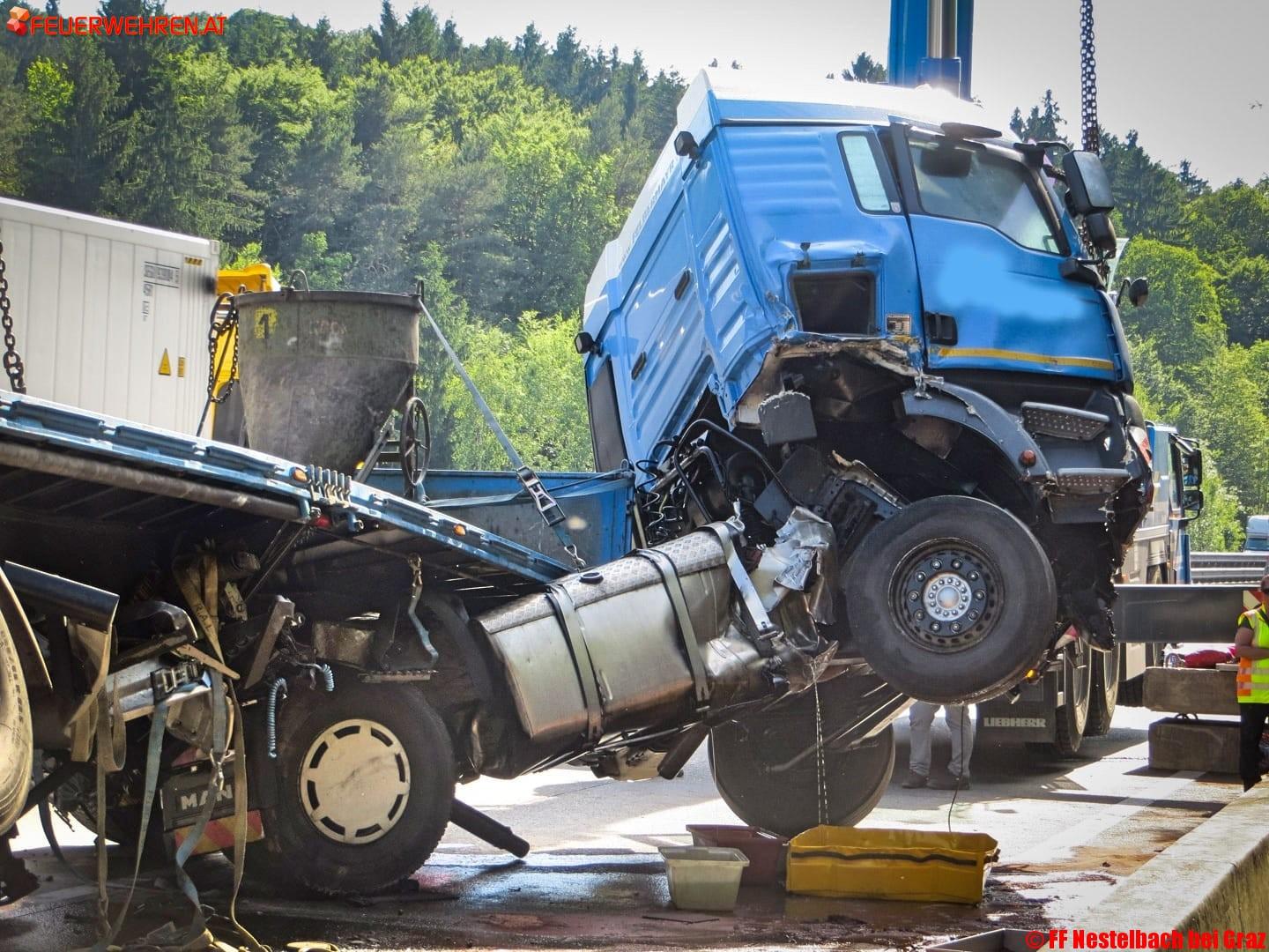 Für die Bergearbeiten am LKW – Sattelzug mussten zwei Bergekräne der Firma Felbermayer hinzugezogen werden, bevor mit der Bergung des Sattelzuges begonnen werden konnte, mussten zunächst die Betonteile umgeladen werden, danach konnte erst der Sattelzug zurück auf die Fahrbahn gehoben werden. Während der Bergungsarbeiten mussten die restlichen circa 500 Liter Dieselkraftstoff, welche sich noch im aufgebrochenen Dieseltank befanden, abgepumpt werden. Der verunfallte Sattelzug wurde mit weiteren Sattelzügen der Firma Felbermayer abtransportiert, während der Bergungsarbeiten musste die A2 Südautobahn im Bereich der Unfallstelle komplett gesperrt werden.