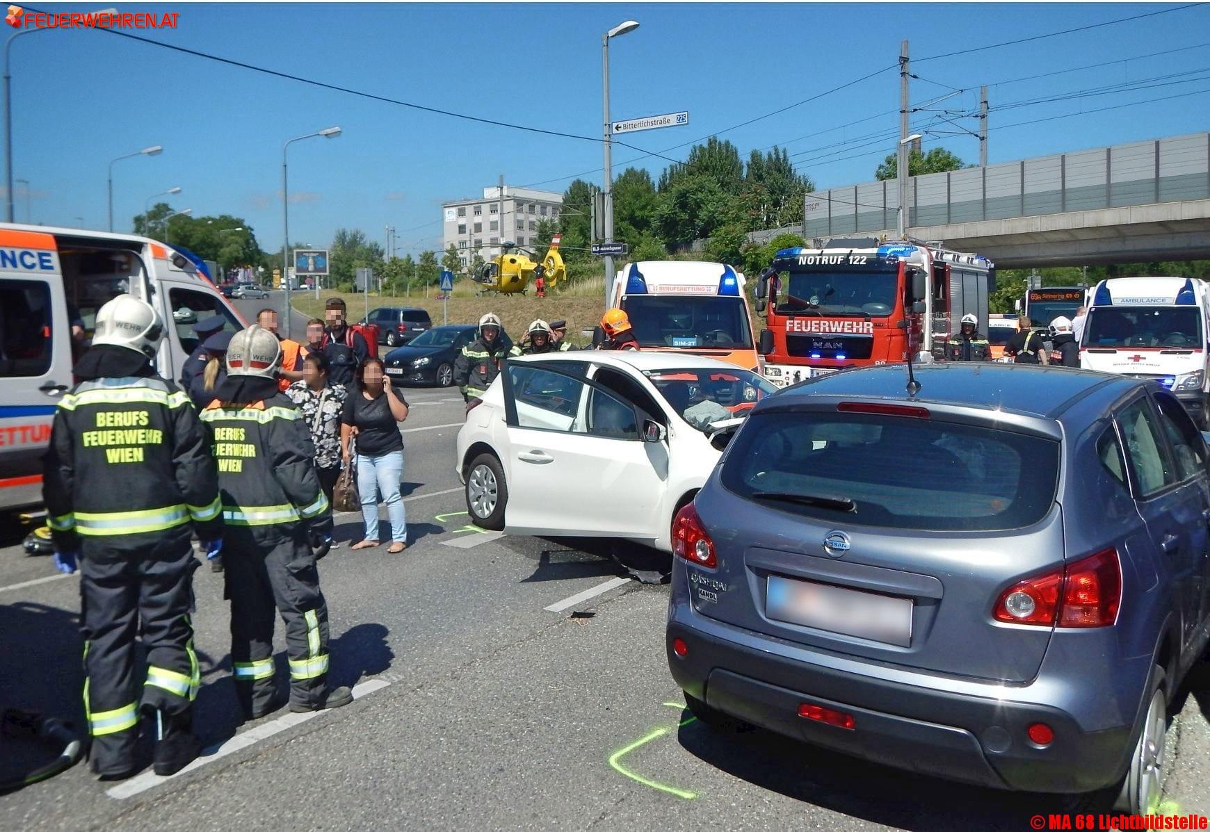 Aus bisher unbekannter Ursache kollidierten zwei Personenkraftwagen im Kreuzungsbereich Leberstraße/ Swatoschgasse in Simmering. Durch den heftigen Aufprall wurden beide Fahrzeuge in die Kreuzung geschleudert und prallten gegen einen weiteren Pkw, der gerade die Kreuzung queren wollte. Ein Kleinkind sowie die Lenker zweier Fahrzeuge wurden schwer verletzt, die Mitfahrer eines Wagens sowie der Lenker des dritten Fahrzeuges wurden leicht verletzt.