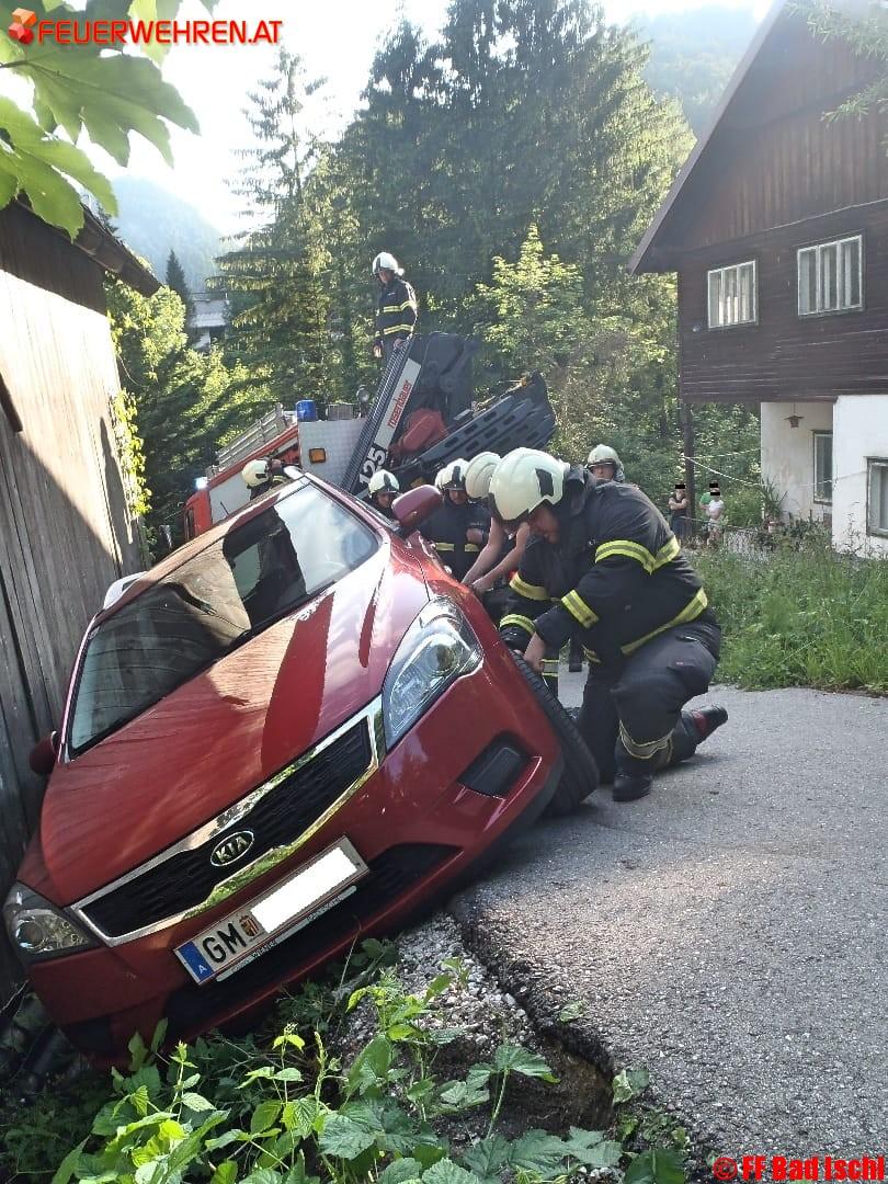 Um das Fahrzeug schonend bergen zu können, wurden die Kameraden der Hauptfeuerwache Bad Ischl nachalarmiert. Mit dem Kran des schweren Rüstfahrzeuges und mit Hilfe von Rangierrollen konnte das Auto wieder auf die Straße gehoben und wieder in die Zeughäuser eingerückt werden.