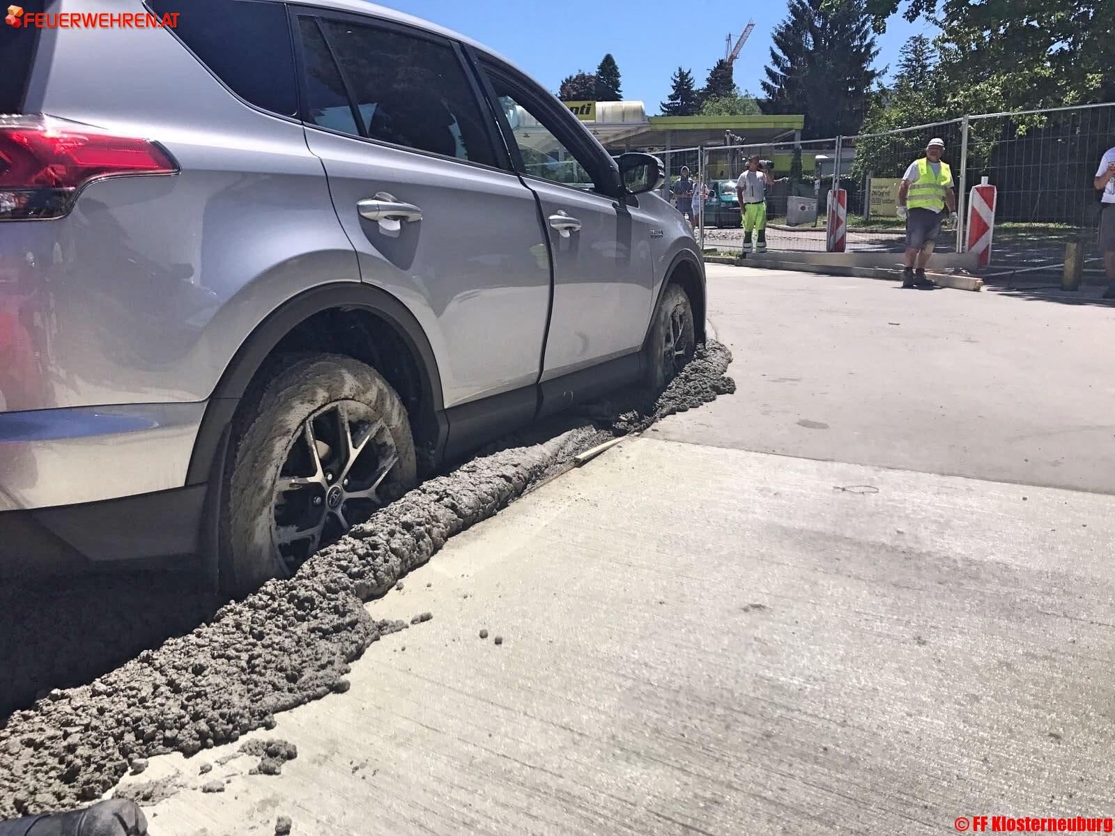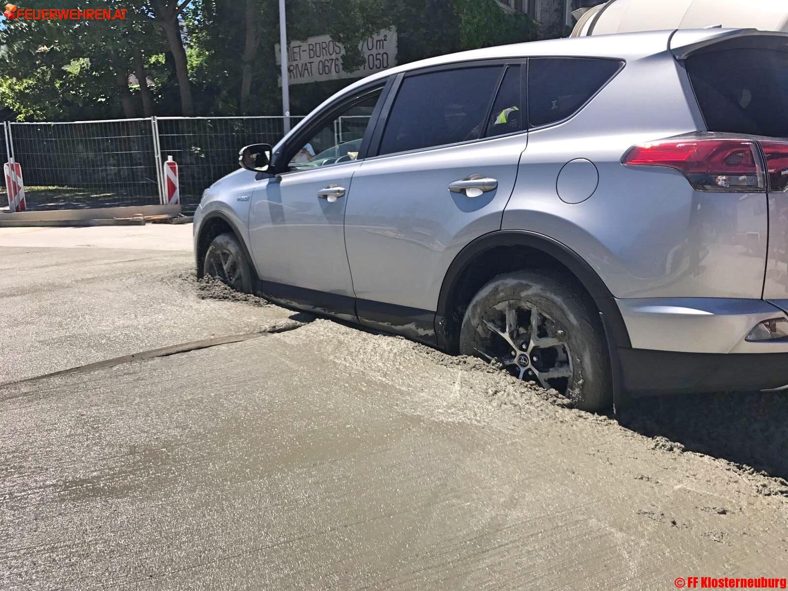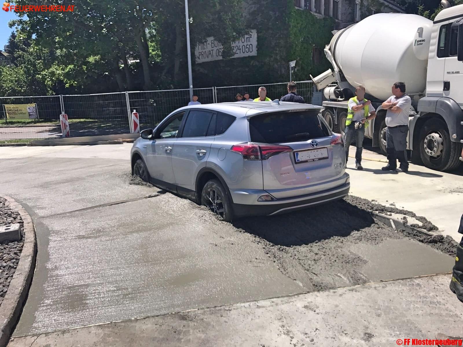 Mit der Seilwinde des Vorausrüstfahrzeuges wurde das quasi einbetonierte Fahrzeug noch vor dem Aushärten des Betons geborgen. Die Feuerwehr Klosterneuburg stand mit 2 Fahrzeugen und 6 Mitgliedern im Einsatz.