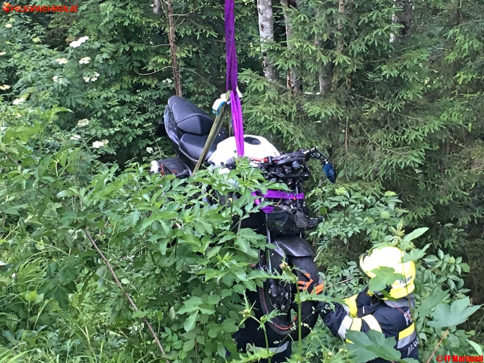 Während der Lenker zum Glück unverletzt auf der Fahrbahn zum Liegen kam, stürzte sein Motorrad über eine Böschung 15 Meter einen steilen Hang hinunter. Mit dem SRF-Hebekran der FF-Mariazell wurde das Motorrad geborgen und abtransportiert. Die Straße wurde dazu kurzzeitig gesperrt.