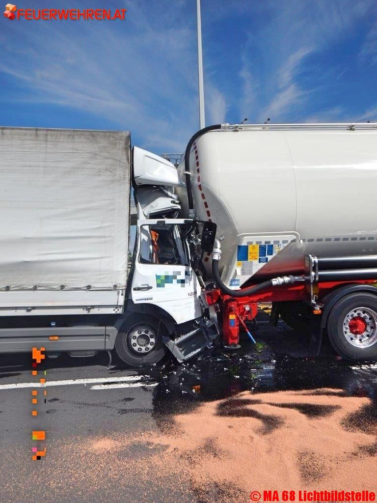 In Folge eines Auffahrunfalls eines LKWs auf einen Sattel-LKW mit Silo-Aufbau wurde der Fahrer des aufgefahrenen LKWs massiv im Führerhaus eingeklemmt.