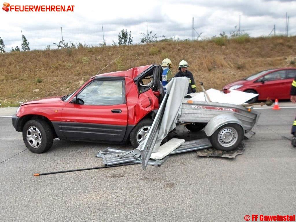 Aus noch unbekannter Ursache kam es auf der Überholspur zu einem Auffahrunfall. Ein Pkw war auf ein Anhängergespann aufgefahren. Durch den Zusammenstoß wurde der Anhänger in das Fahrzeuginnere gedrückt.