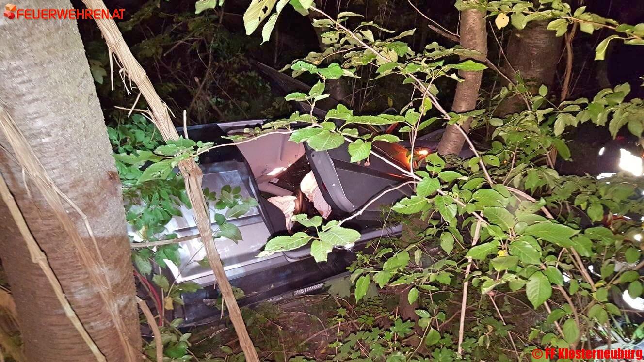 Ein talwärts fahrender PKW Lenker verlor die Kontrolle über sein Fahrzeug und stürzte über eine Böschung. Dabei krachte er gegen einen Baum und verkeilte sich anschließend zwischen wie weiteren Bäumen.